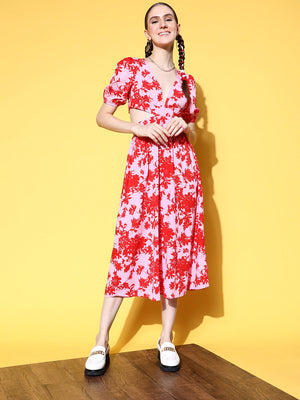Berrylush Women Pink & Red Floral Printed V-Neck Cutout Tie-Up Crepe A-Line Midi Dress