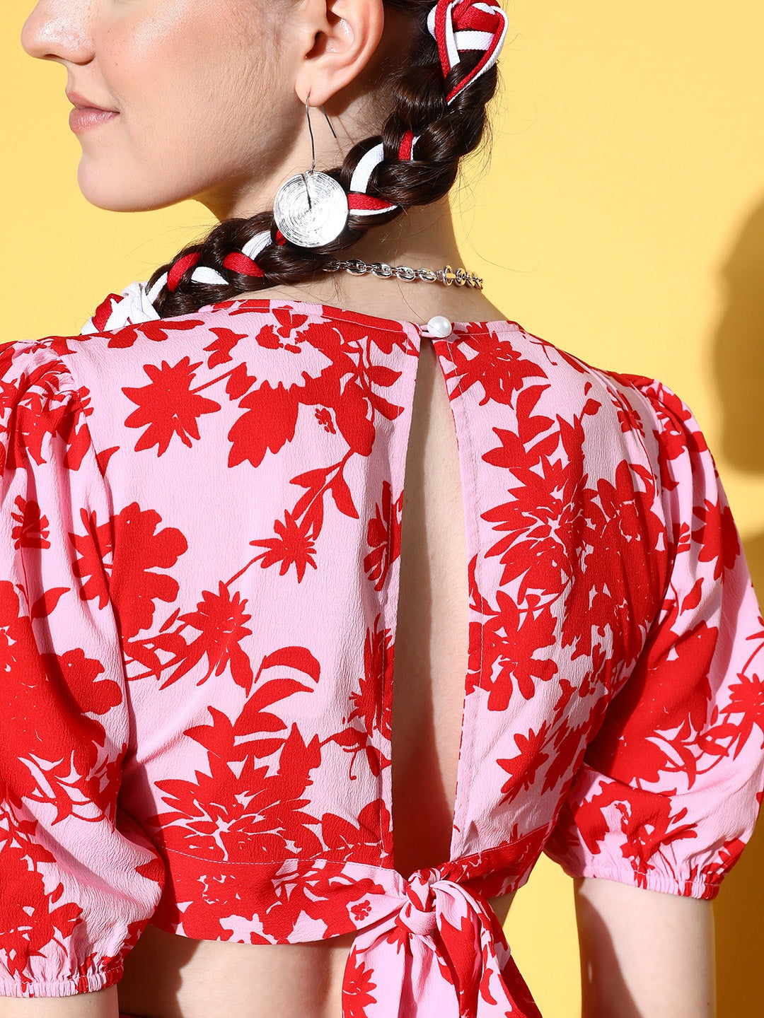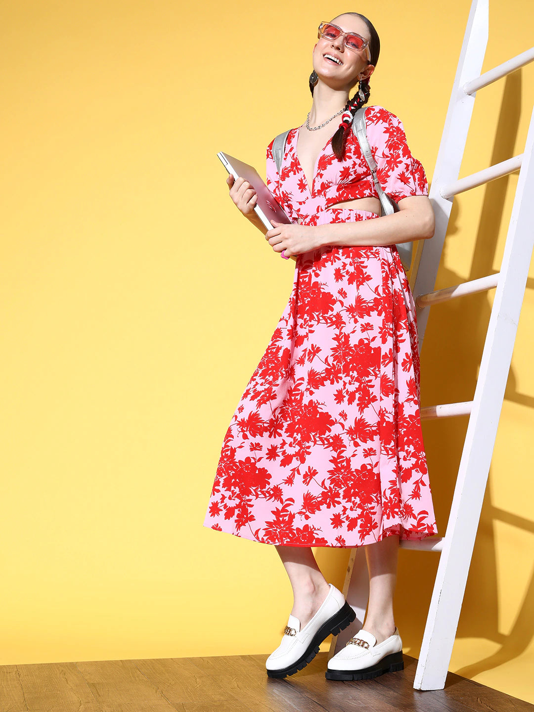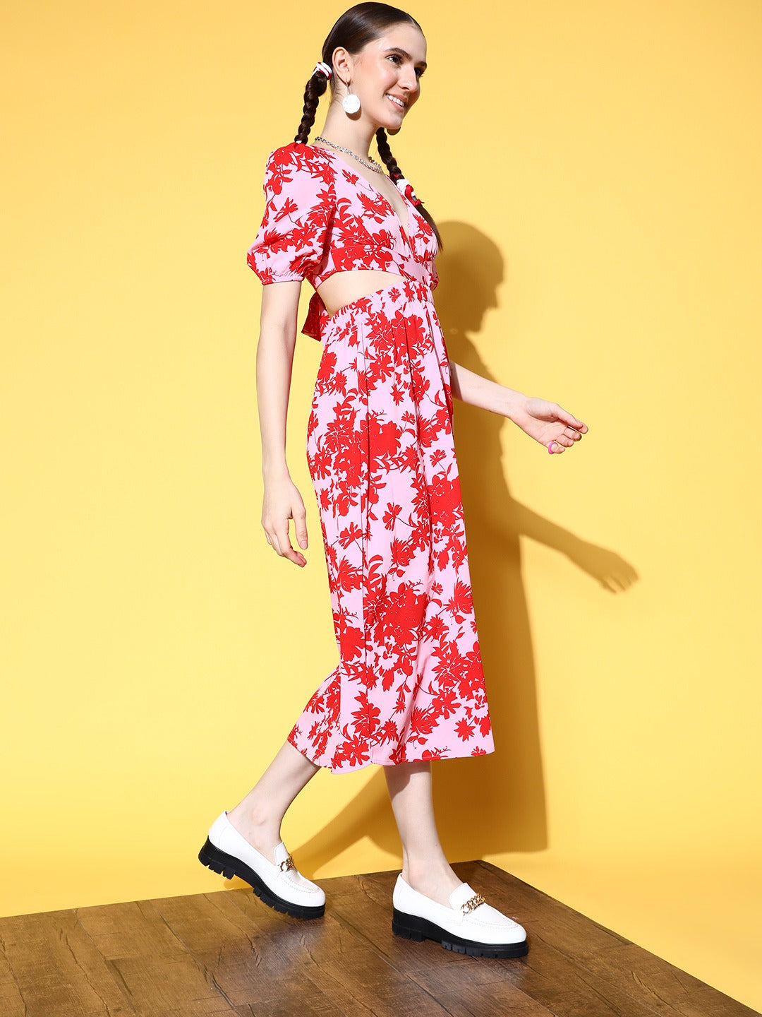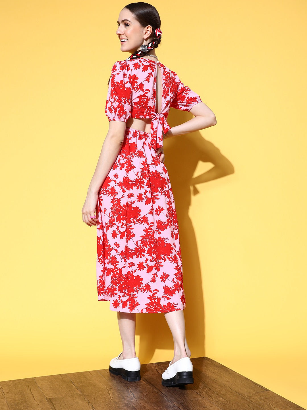 Adorn yourself with a few more fashion elements that match your vibes just like this cute Pink and Red Floral Crepe A-Line Midi Dress designed by Berrylush. This beautiful dress elegantly complements your natural curve with its A-Line shape that offers a curve-hugging yet comfortable silhouette. Detailed with a tie-up design that adjoins fascinating charm and decorative finish to this dress. Also, the button closure supports easy to wear style with a smart appearance. Walk out looking stunning for your outdoor picnic by wearing this midi dress with a pair of comfy sandals, cute earrings, and a side bag.