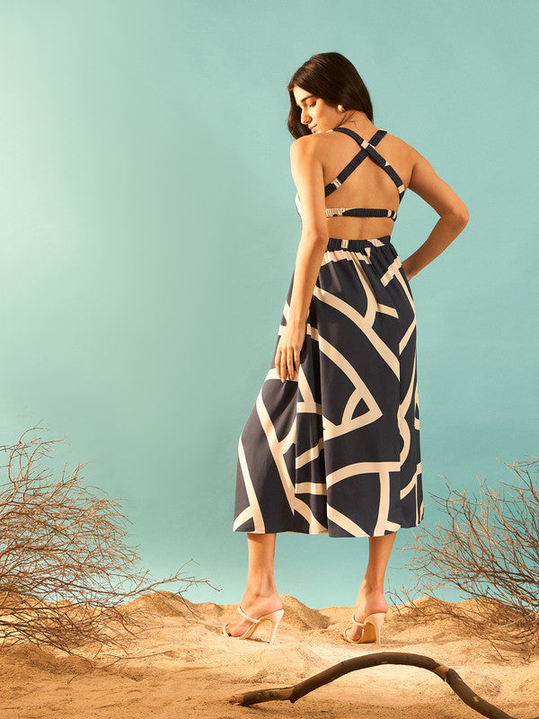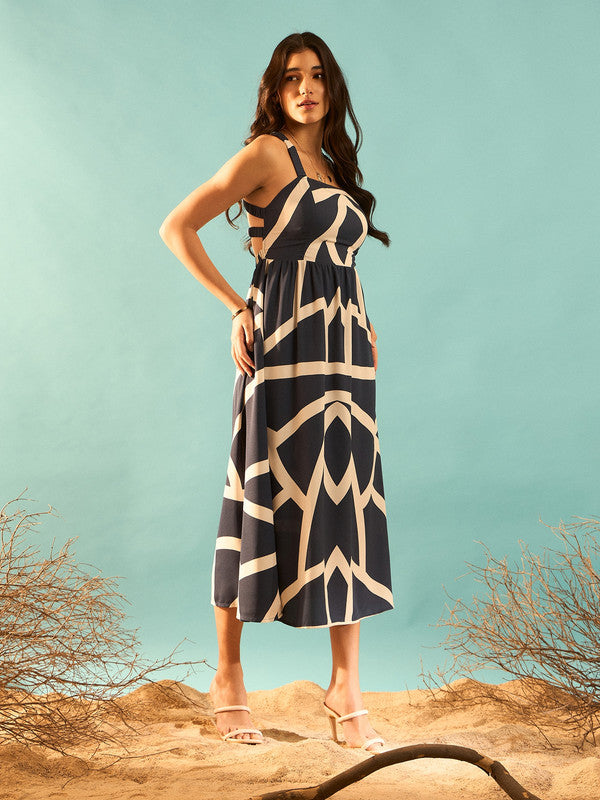 Berrylush Women Navy Blue & White Geometric Printed Square Neck Crisscross Cutout Back Pleated Midi Dress