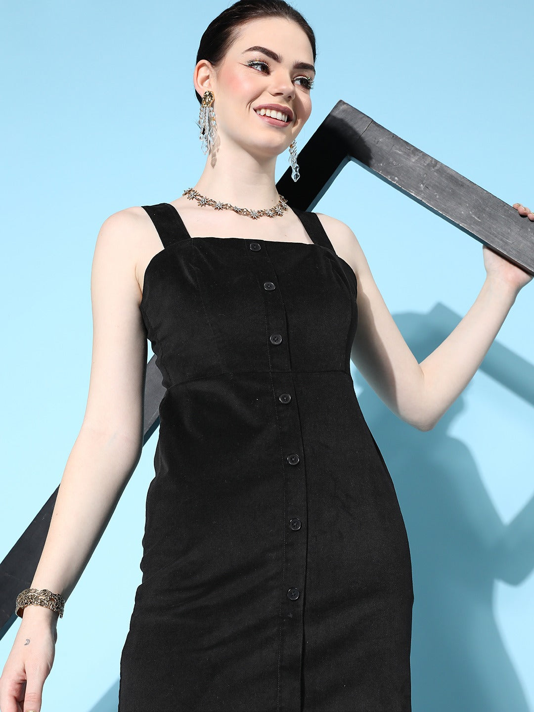 Accentuate your casual fashion game with bold styles just like this bedazzling Solid Black Square Neck Sleeveless Cotton Straight Hem Bodycon Mini Dress designed by Berrylush. Sculpted in a bodycon shape to present an illusion of an hourglass figure with a body-hugging silhouette. The mini length of this dress gives your beautiful legs an alluring appeal with a dash of contemporary charm. Also, the woven detailing amp up the structural fit of this dress with resistance from abrasion. Get a stunning look by wearing this mini dress with a pair of silver high heels, minimalistic silver jewellery, and a matching clutch.