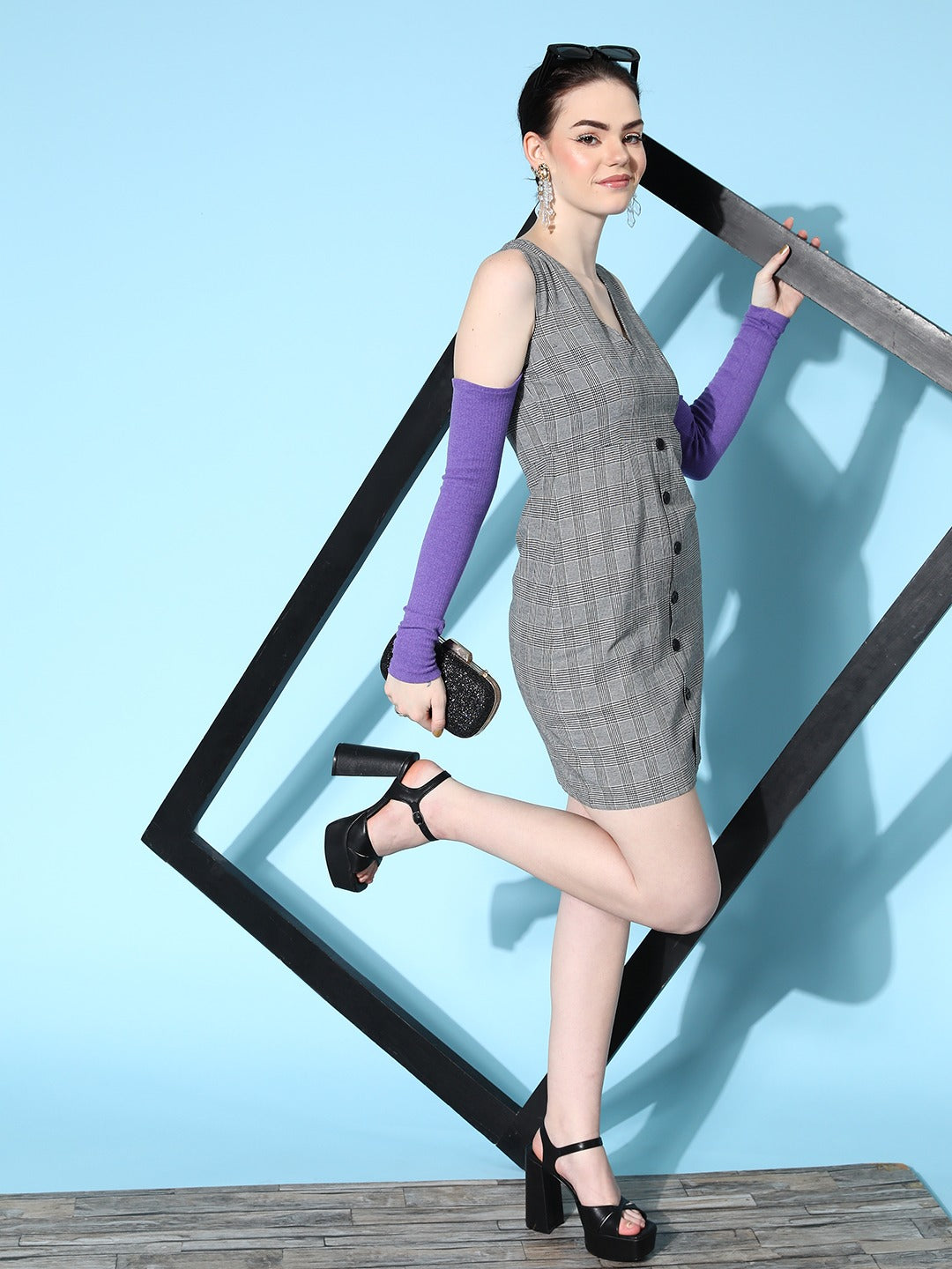 Enter the league of sophistication and timeless style with this gorgeous Grey & Black Check Printed V-Neck Single-Breasted Cotton Bodycon Mini Dress from Berrylush. Designed with a V-neckline to give your neck an enticing appeal with limitless breathability. Styled with a sleeveless design to lend an alluring exposure to your arms with hassle-free movements. Also, the bodycon shape beautifully flatters your curves and shows off your astonishing figure. Get a fabulous final appearance by teaming up this mini dress with a pair of ankle-length boots, diamond earrings, and a sling bag.