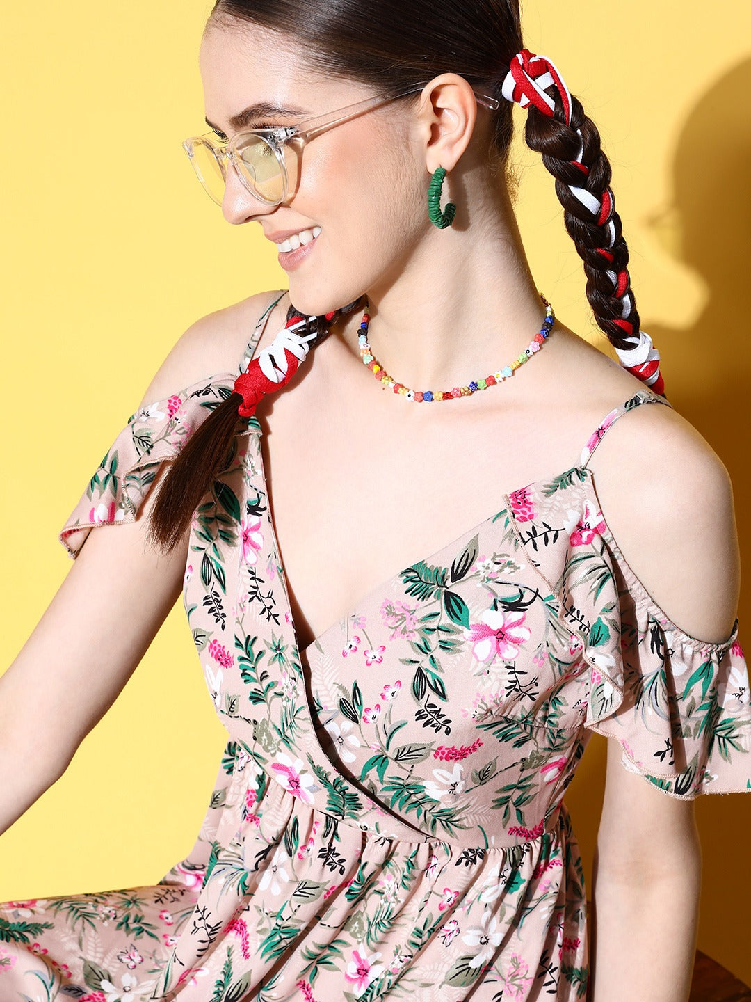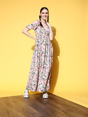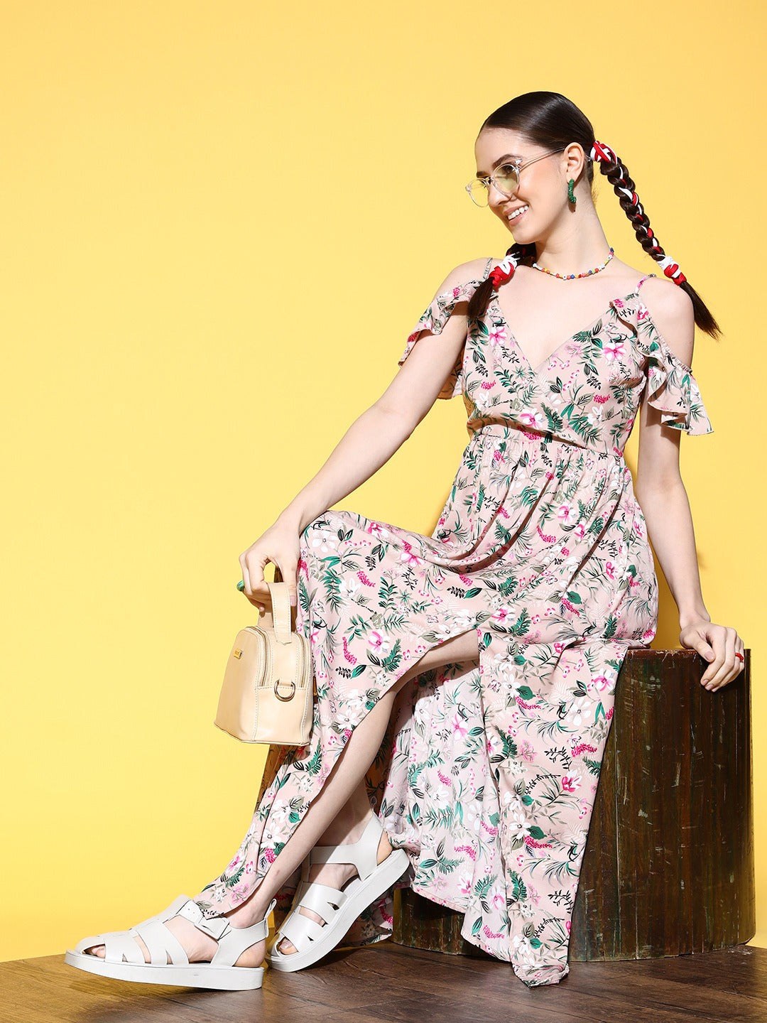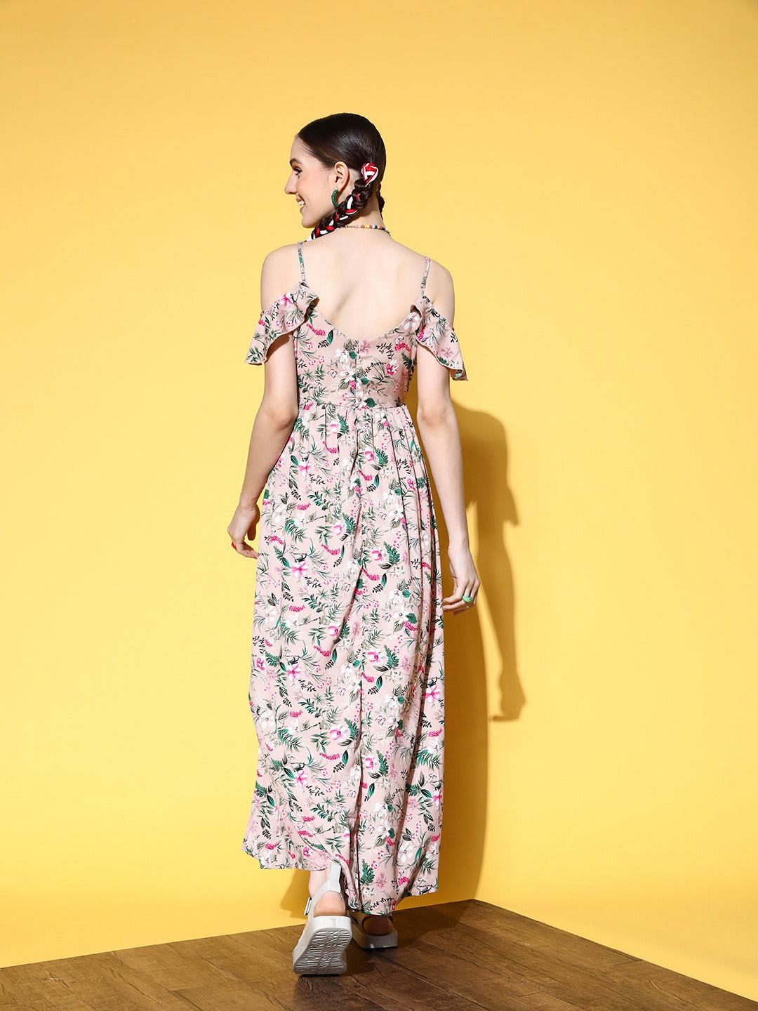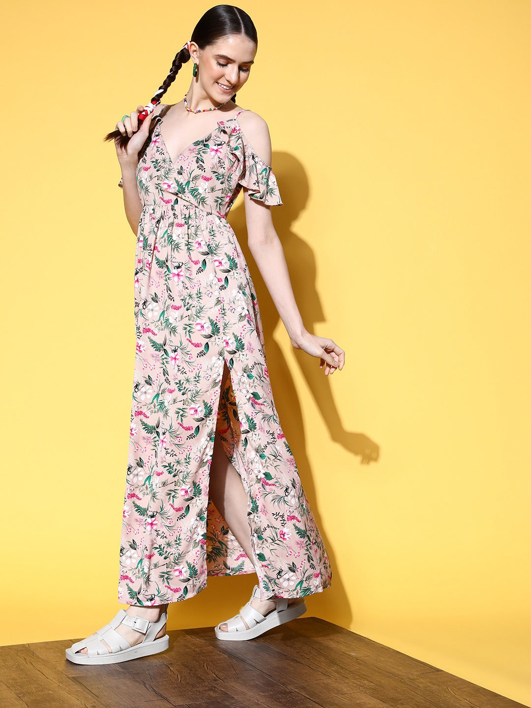 Berrylush Women Pink & Green Floral Printed V-Neck Cold-Shoulder Sleeve Crepe Flared Maxi Dress