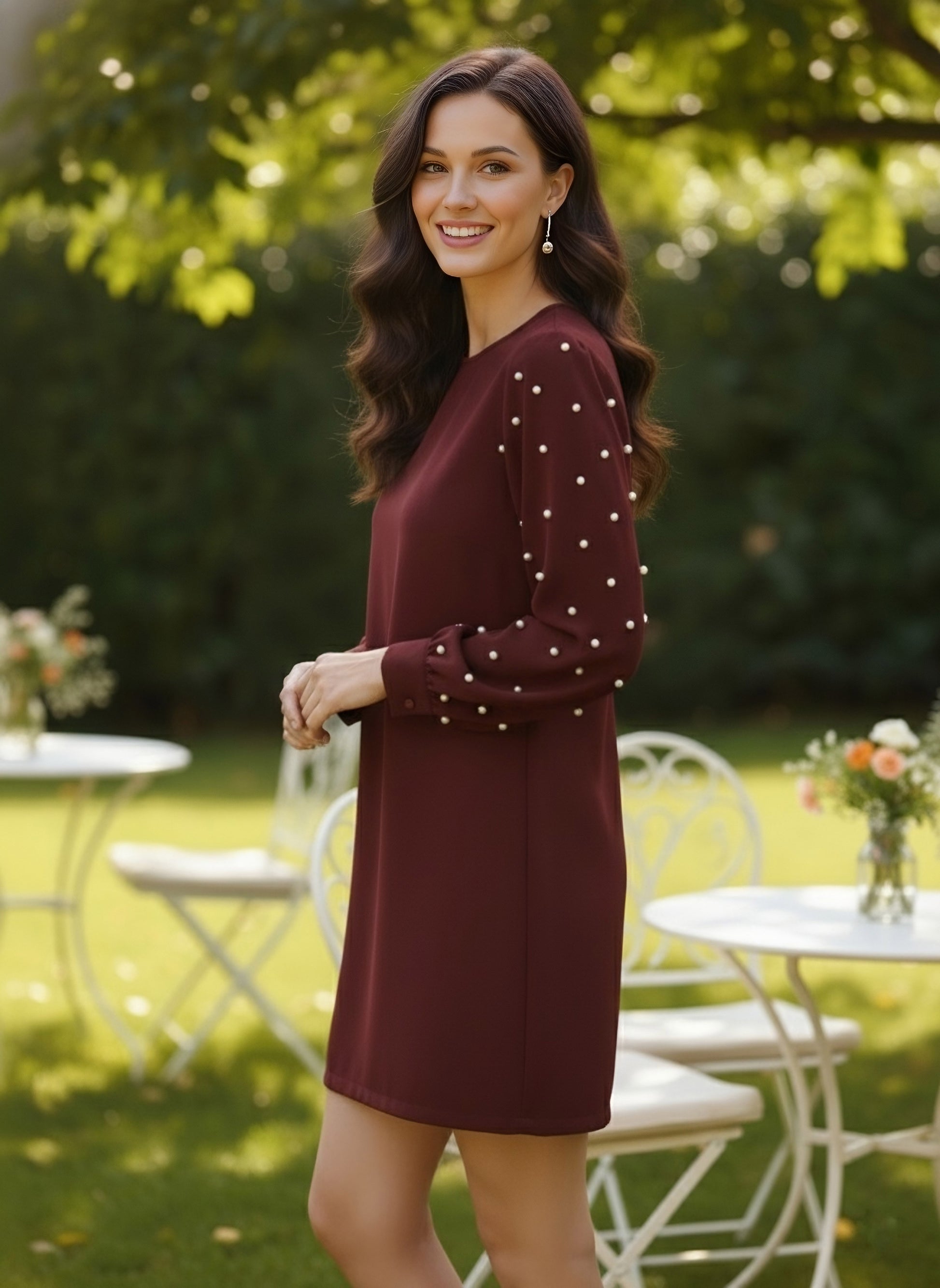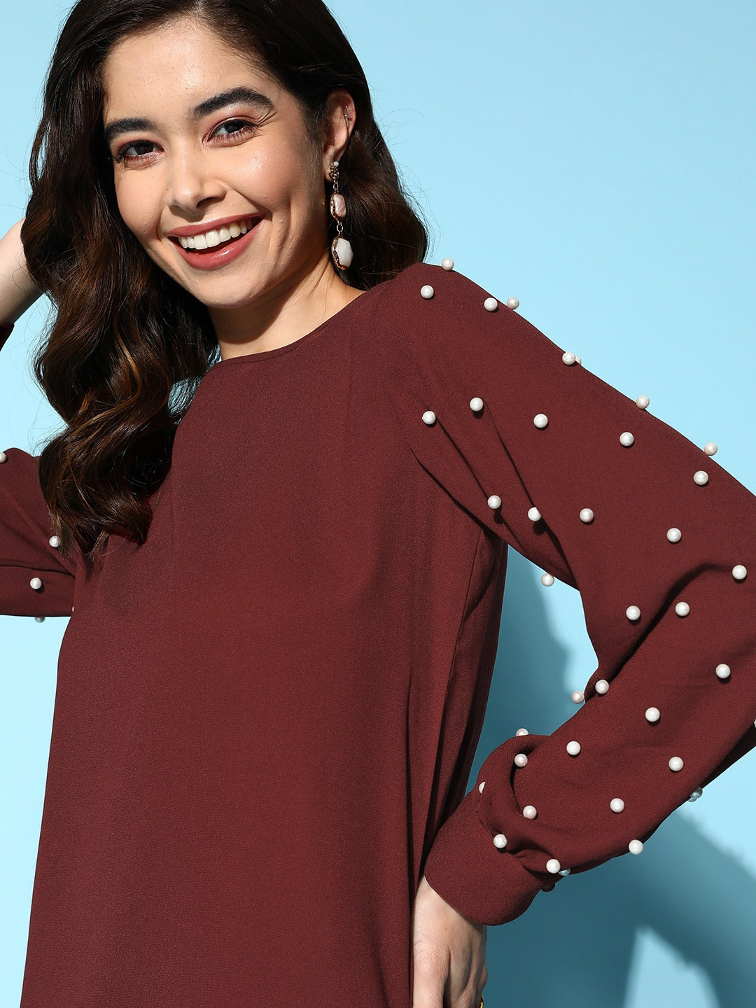 Take centre stage this party season with your unique yet voguish style by donning this mesmerizing Solid Maroon Round Neck A-Line Mini Dress designed by Berrylush. Decorated with pearl embellished surface styling that lends this dress a sparkly and luxurious appearance. Punctuated from the finest polyester material that offers this dress low maintenance with the sweat-wicking property. Also, the straight hemline gives this dress a contouring silhouette with a comfy feel to show off your natural curves. Be under the limelight as your enter the party venue with your glamorous look by partnering this dress with a pair of high-heels, minimalistic silver jewellery, and your favourite sling bag.