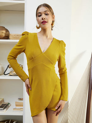 Fill your capsule closet with stylish options that keep you fashionable by adding this gorgeous Solid Yellow V-Neck Puff Sleeves Tulip Hem Knitted Wrap Mini Dress designed by Berrylush. The most adorned element of this dress is the cinematic duo of yellow shape with a solid pattern that presents the retro style with a modern touch. The wrap shape of this dress frames a curve-hugging silhouette while the V-neck design lends an alluring appearance to your neckline. Moreover, the long-puffed sleeves give attractive coverage to your arms while supporting comfortable movement. Wear this wrap mini dress with a pair of white sneakers and a cute side bag for an adorable look.