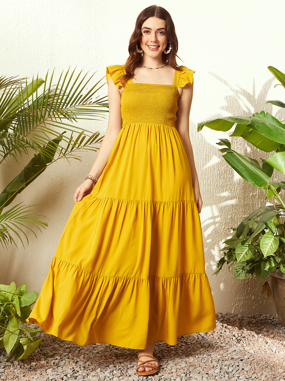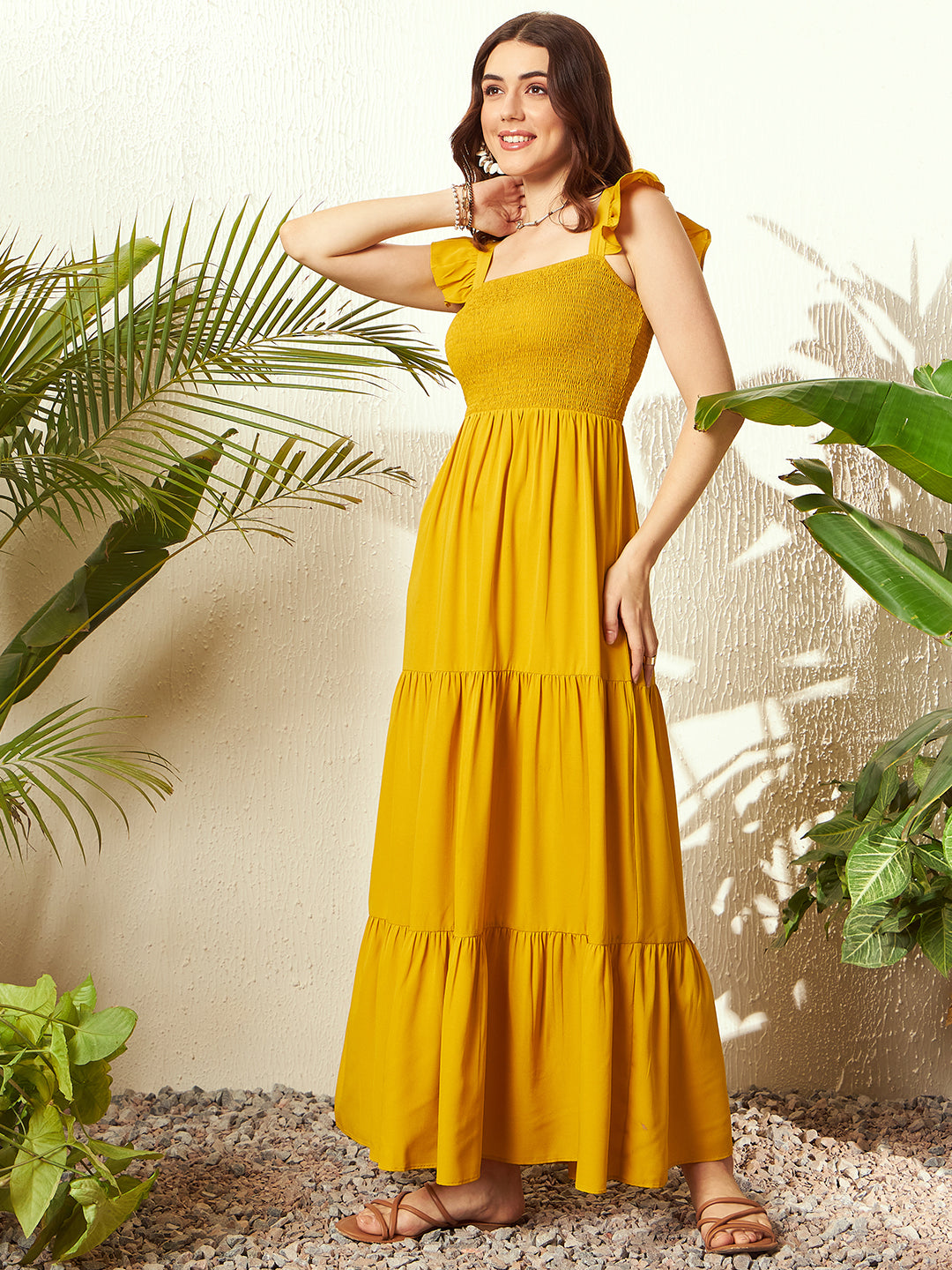 Introducing the Berrylush Solid Yellow Square Neck Sleeveless Smocked Maxi Dress, your quintessential travel companion. Crafted from premium polyester with a woven weave, this dress promises both durability and comfort on your adventures. The radiant yellow color captures the essence of joy and freedom, perfect for exploring new horizons. Designed with a flattering square neckline and sleeveless cut to keep you cool under the sun, it also features exquisite smocking detail that enhances its elegance. The ruffled detailing adds a playful twist to its solid pattern while the flared hemline ensures graceful movements as you wander.
