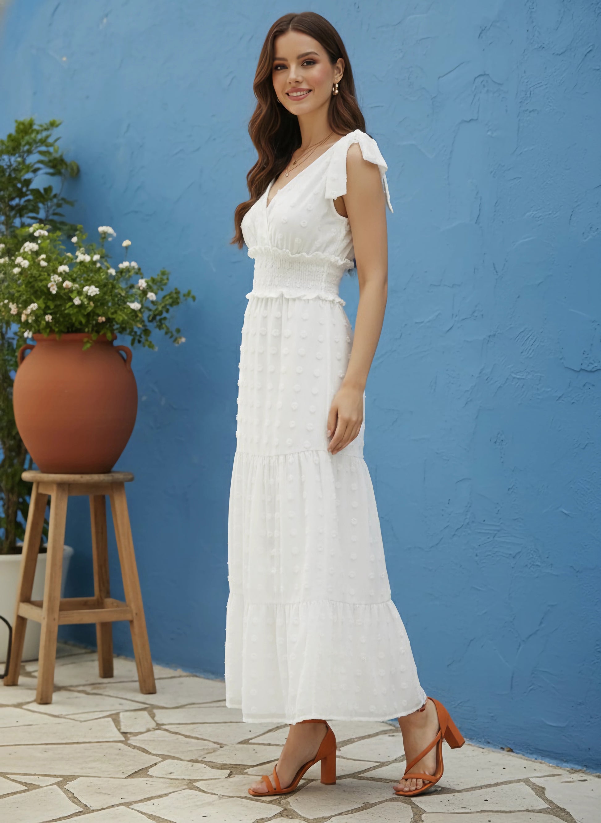 Intensify your capsule closet with a twist of fascinating style, trendy prints, and a splash of attractive patterns just like this White Self-Design Pattern V-Neck Sleeveless Tie-Up Straps Smocked Maxi Dress from Berrylush. Tailored in a tiered style that lends this dress an astonishing voluminous silhouette accompanied by enchanting styling elements that instantly uplift your fashion game. Presenting maxi length that gives this dress a flattering note with an eye-catching coverage to your beautiful legs to add mesmerizing texture to your walk. Also, the amusing amalgam of gorgeous white shade and self-design pattern put together a captivating design. Attend your friend's celebration party in a splendid look by matching up this maxi dress with block heels, minimalistic silver jewellery, and a chic sling bag.