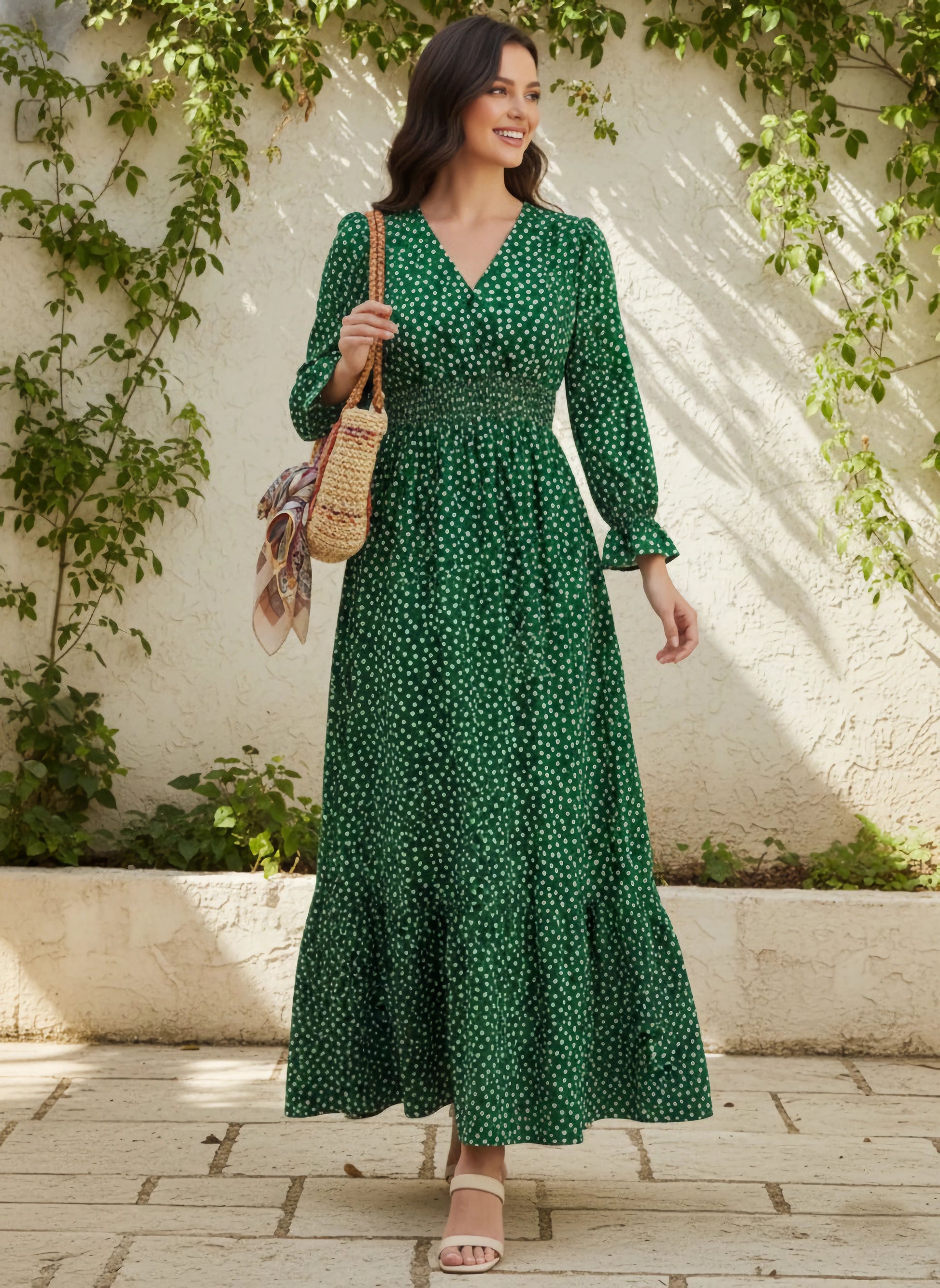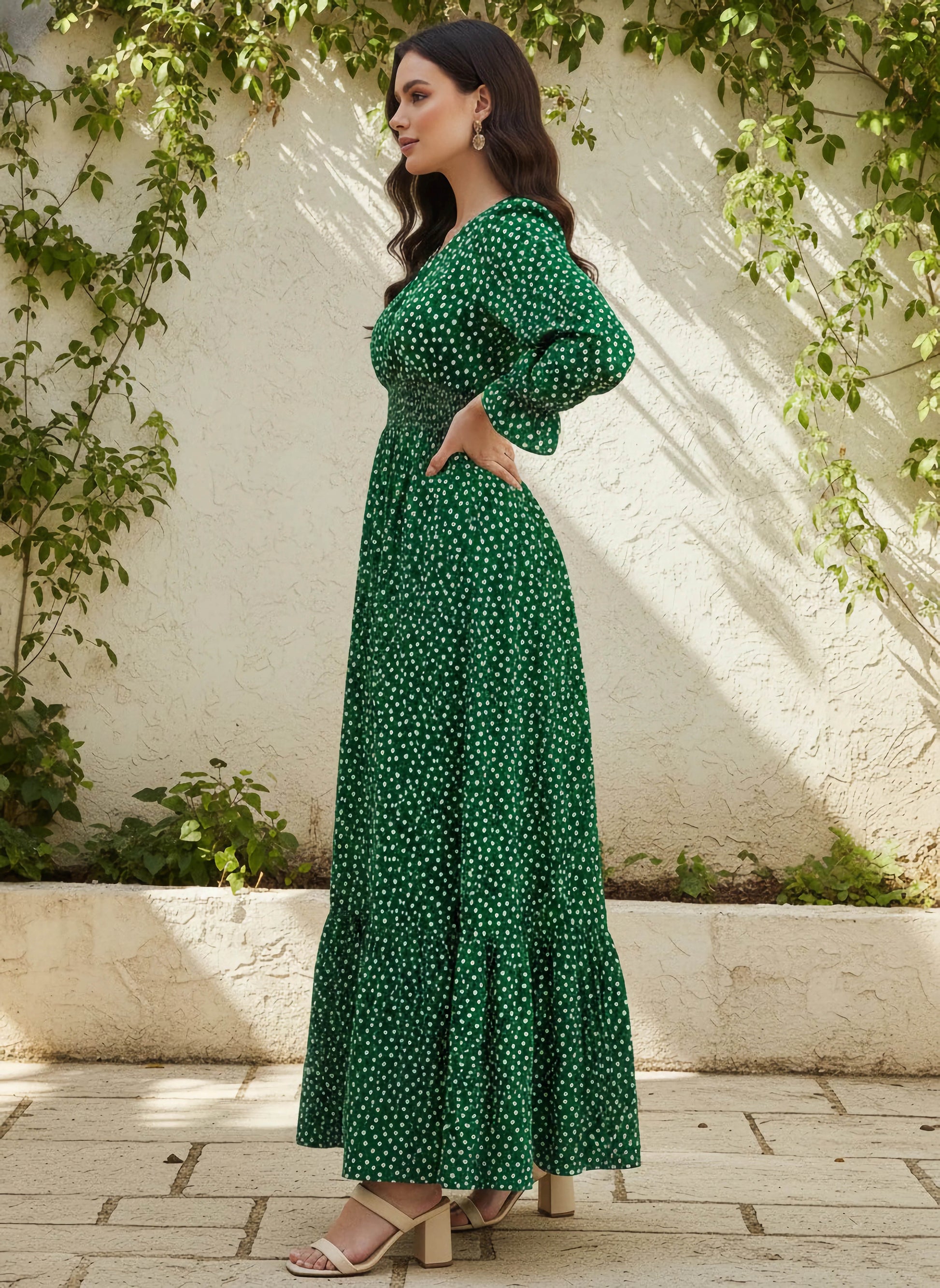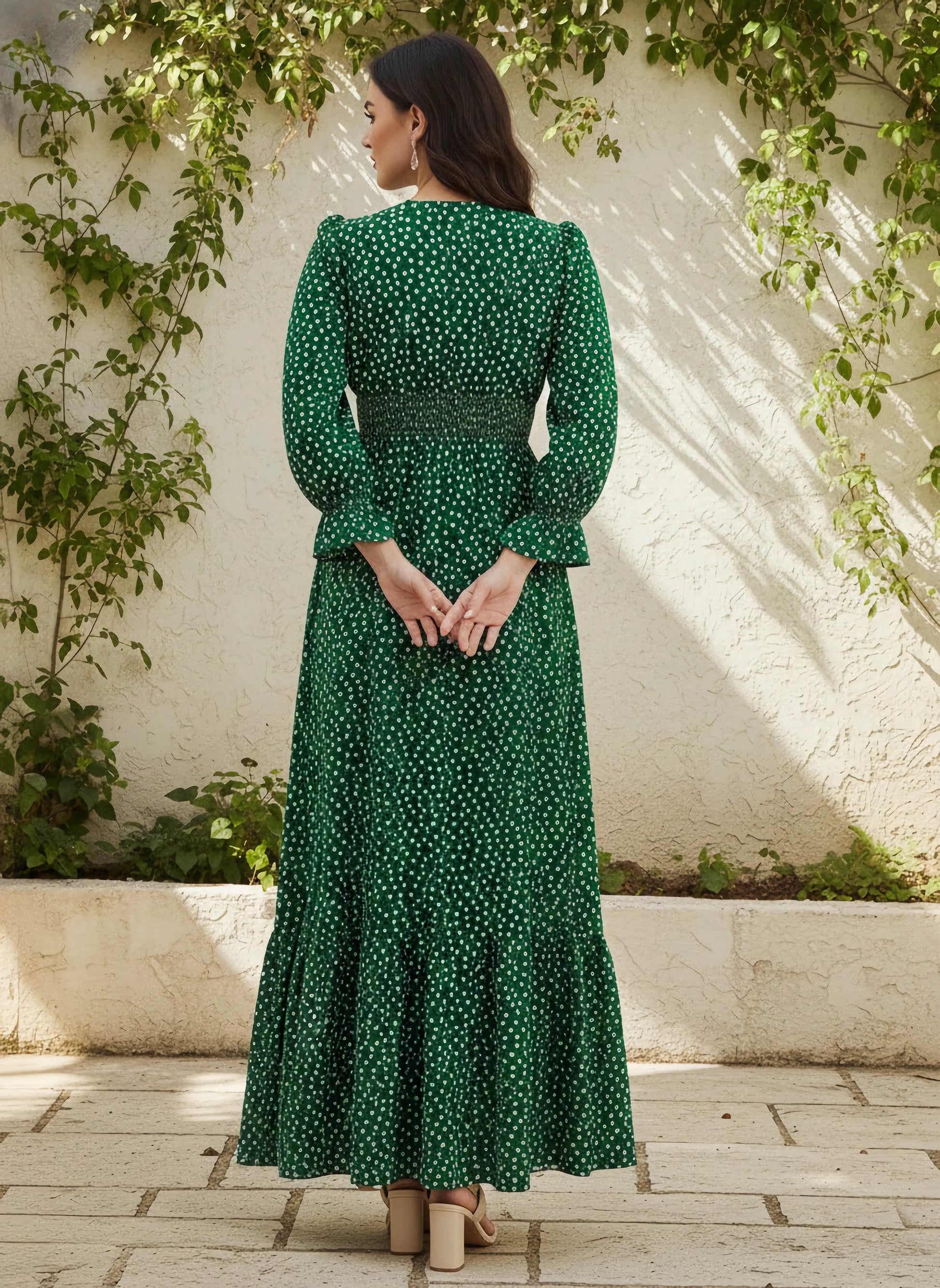 Introducing the Berrylush Green & White Floral Printed A-Line Maxi Dress, where elegant design meets casual sophistication. Perfect for any laid-back gathering, this dress features an enchanting floral pattern set against a fresh green and white palette that captures the essence of spring. The V-neckline and flirty ruffled surface styling add a touch of romance, while the bishop sleeves bring a vintage flair to your look. Crafted from premium polyester with an opaque finish, it promises both comfort and style. The flounce hemline sways gracefully as you move, making every moment feel special in this exquisite maxi-length creation by Berrylush.