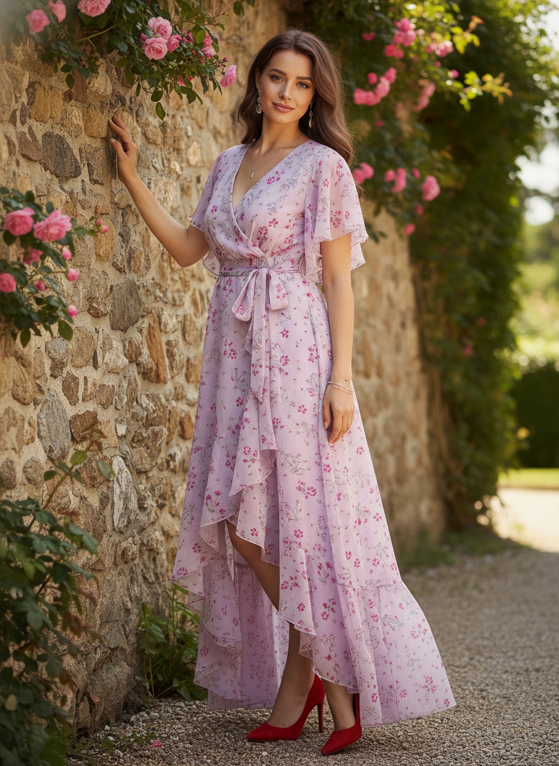 Elevate your wardrobe with the enchanting charm of Berrylush's Purple & Pink Floral Printed V-Neck Waist Tie-Up Crepe Maxi Dress. This beautifully crafted piece features a captivating floral print, merging hues of purple and pink to create an eye-catching palette perfect for any casual occasion. Designed with the modern woman in mind, it boasts a flattering v-neckline and an alluring high-low hem accented by delicate pleats for that touch of femininity. The lightweight crepe fabric ensures both comfort and elegance, making this dress as pleasant to wear as it is to behold. Short flared sleeves add a playful twist while contributing to its airy feel. With adjustable waist tie-up closure, you're guaranteed a customized fit that highlights your silhouette flawlessly. Ideal for weekend outings or casual get-togethers, this opaque maxi-length garment marries convenience and style without compromise - ensuring you look effortlessly chic wherever life takes you.
