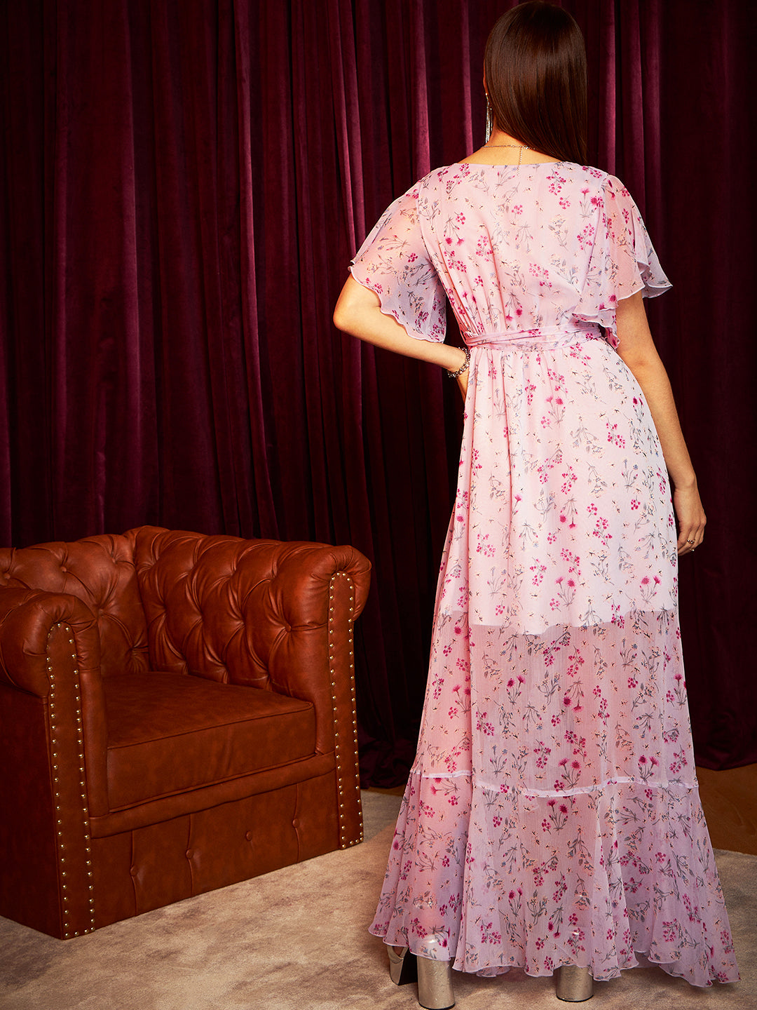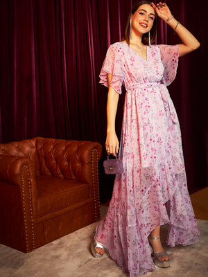 Berrylush Women Purple & Pink Floral Printed V-Neck Waist Tie-Up Crepe High-Low Hem Pleated Maxi Dress