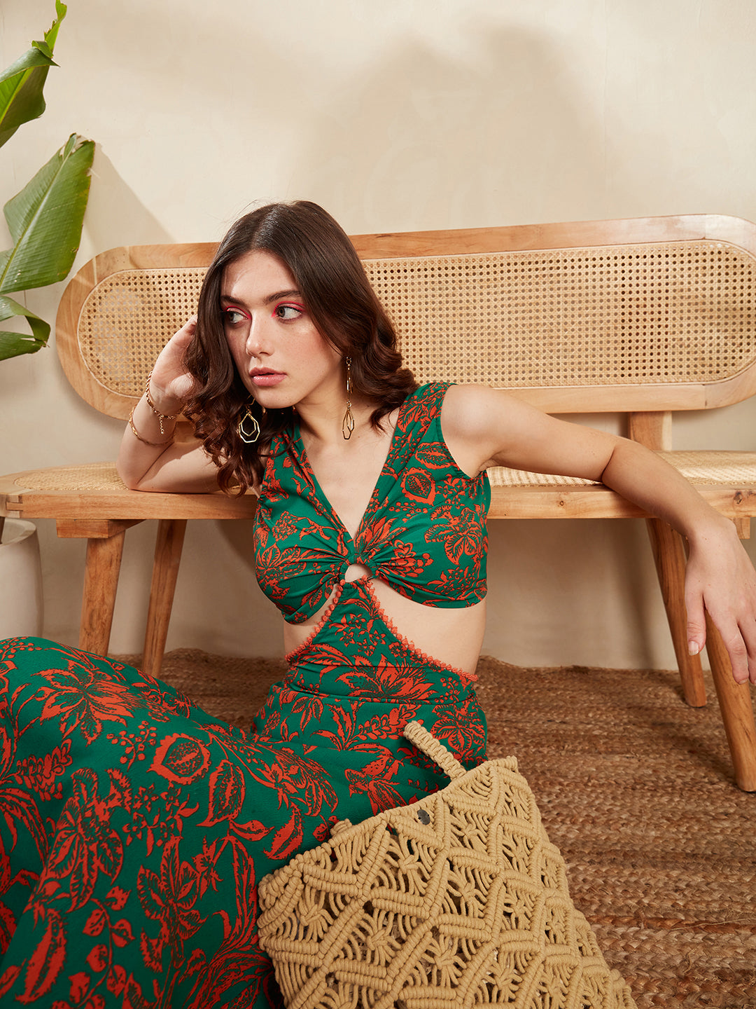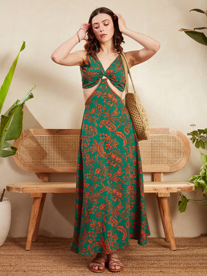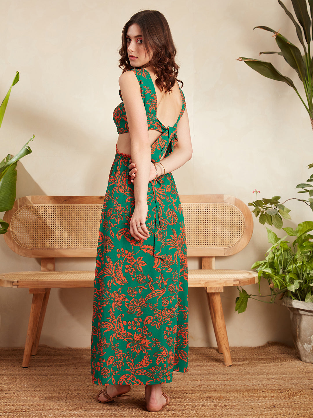 Berrylush Women Green & Orange Floral Printed V-Neck Ring Linked Cutout Tie-Up Backless Straight Hem Maxi Dress