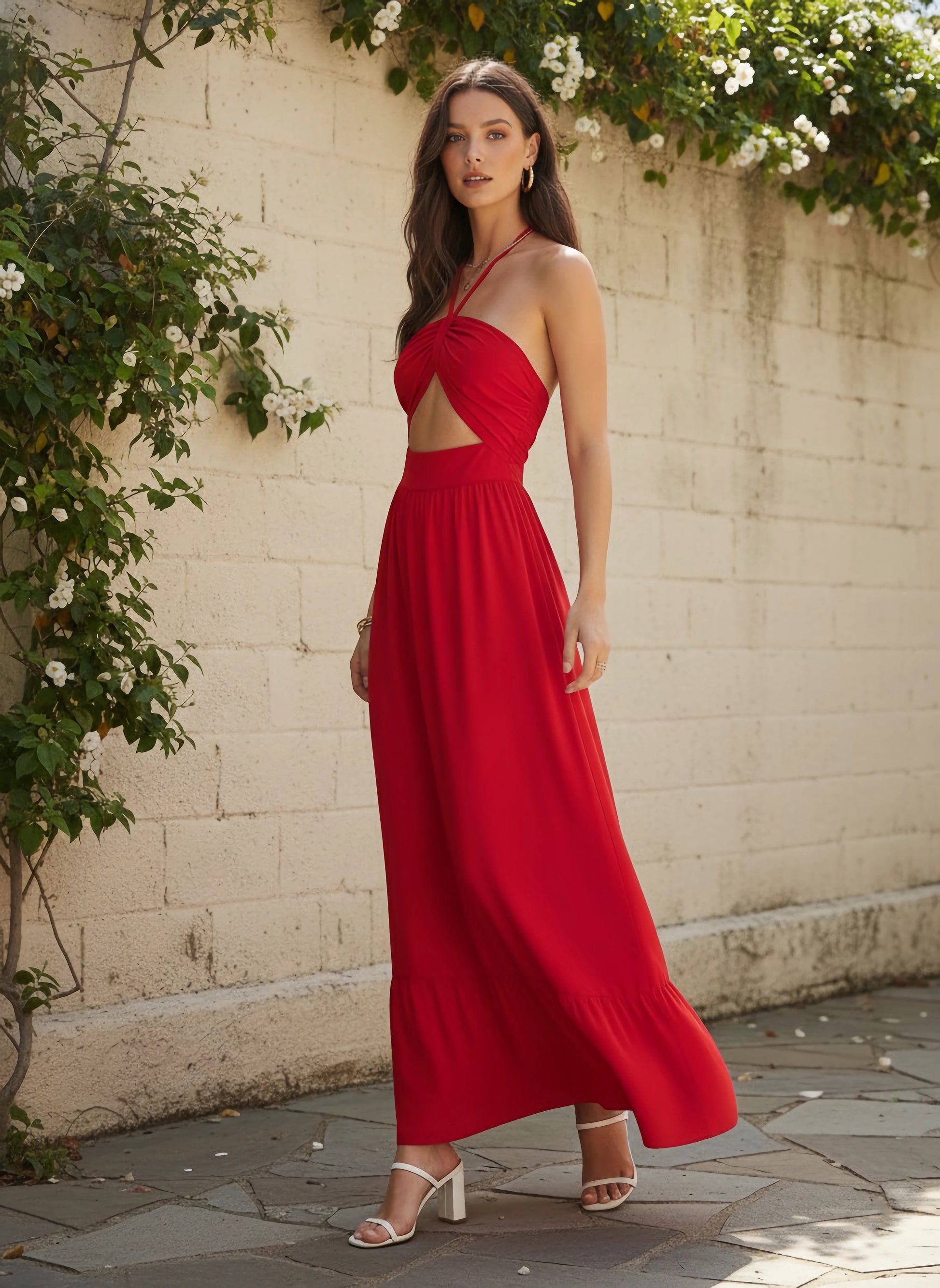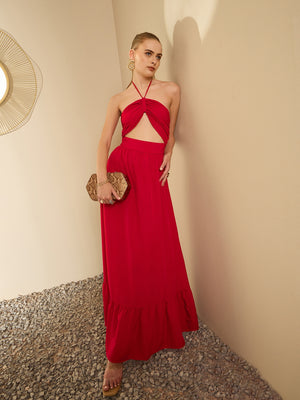 Berrylush Women Red Solid Halter Neck Tie Backless Maxi Dress