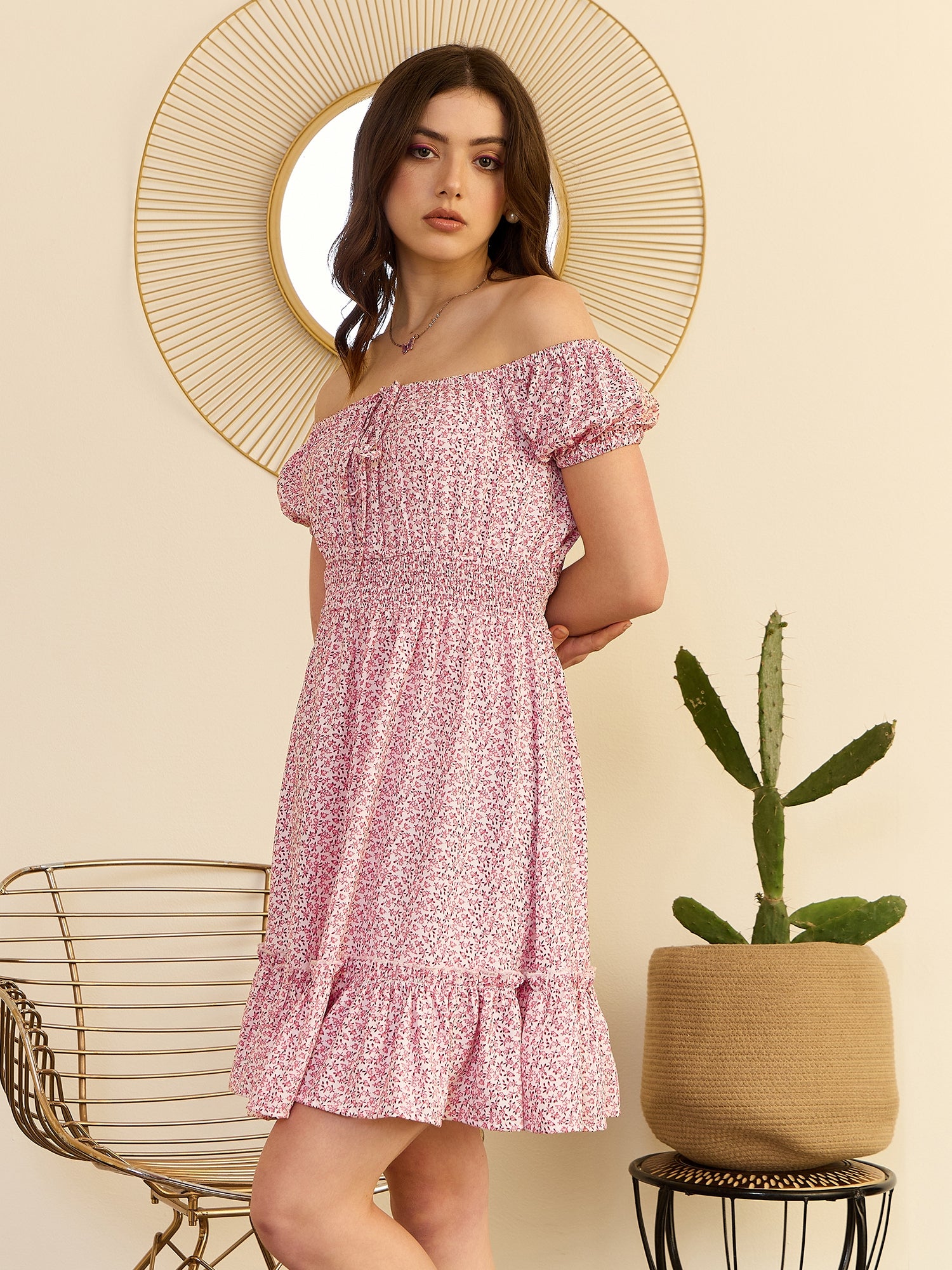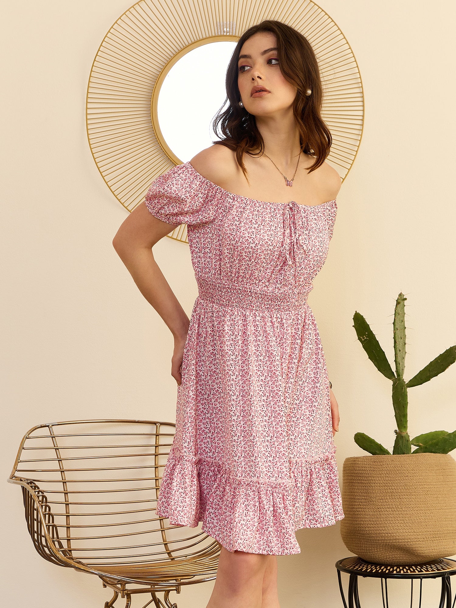 Berrylush Women White & Pink Floral Printed Off-Shoulder Neck Front Tie-Up Pleated Fit & Flare Mini Dress
