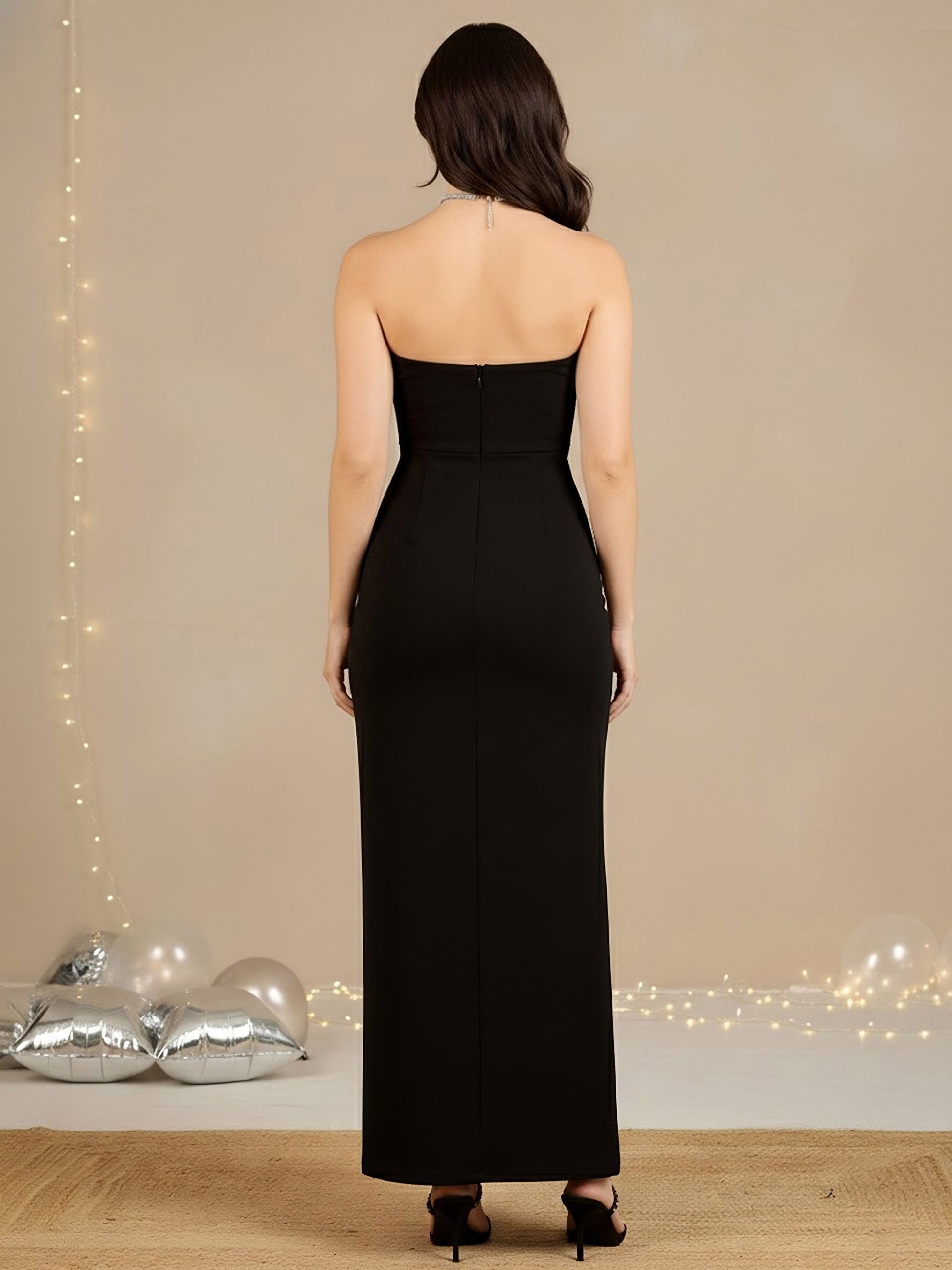 Step into the spotlight with Berrylush's Solid Black Strapless Neck Sleeveless Backless Thigh-High Slit Straight Hem Knitted Bodycon Maxi Dress. Perfect for any glamorous party, this elegant maxi dress showcases a sultry strapless neckline and a daring backless design that adds a touch of mystique. Crafted from premium polyester with a knitted weave, it offers both comfort and style. The thigh-high slit introduces an alluring detail that enhances your movements, while the sleek straight hemline keeps the look polished and sophisticated. Completed with an opaque finish and concealed zipper closure for seamless wearability—your go-to choice to make heads turn at any evening event!