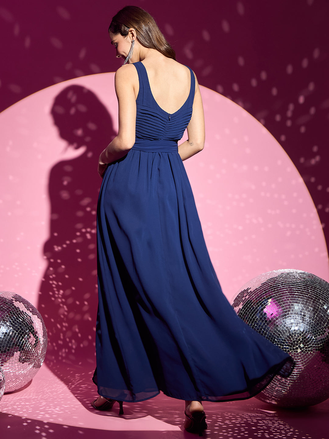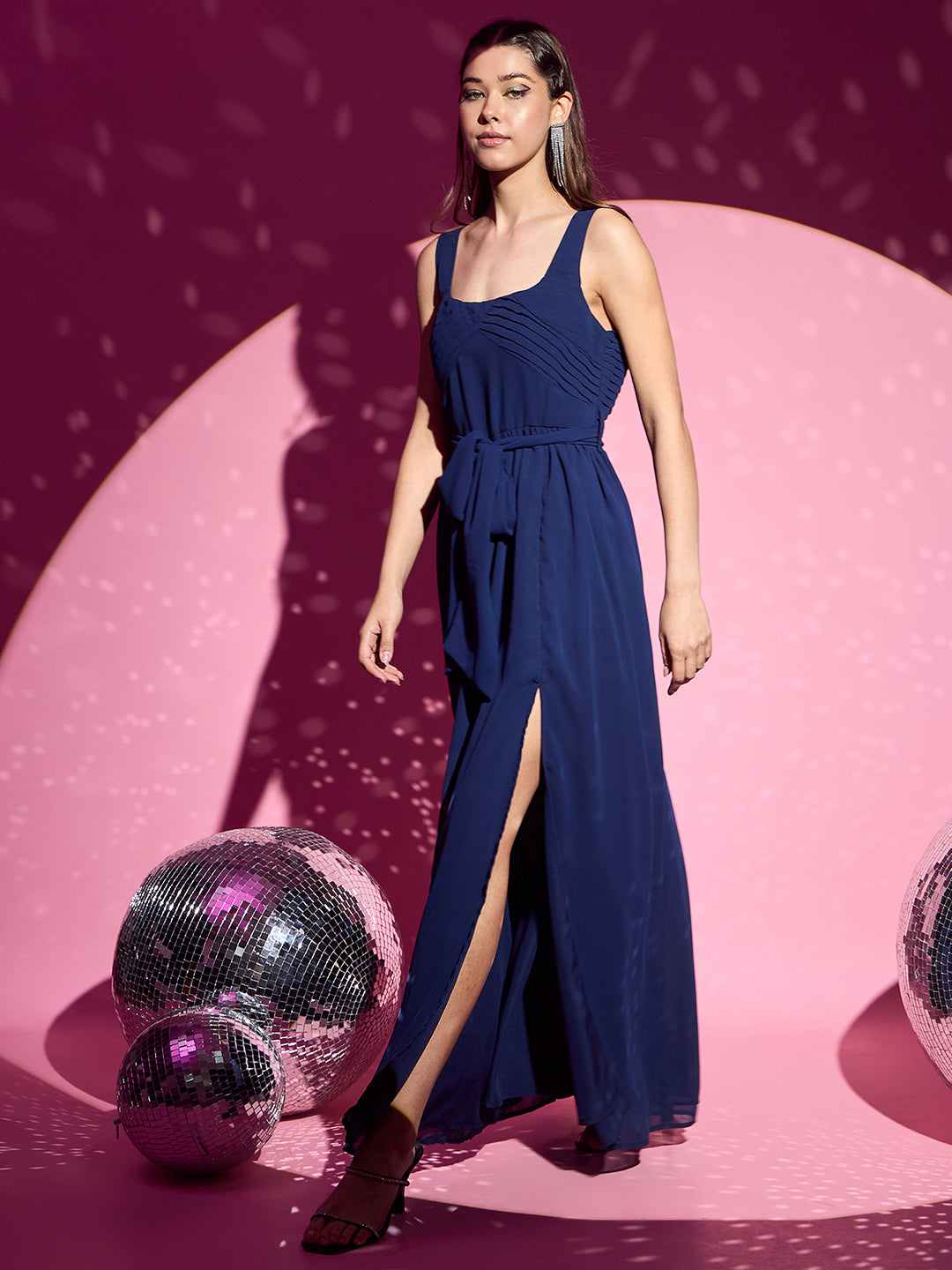 Berrylush Women Solid Navy Blue Scoop Neck Sleeveless Tie-Up Waist V-Back Thigh-High Slit Pleated Maxi Dress