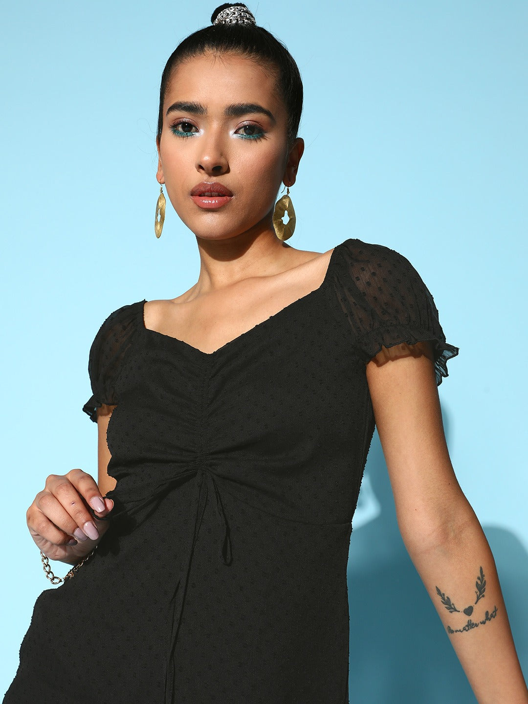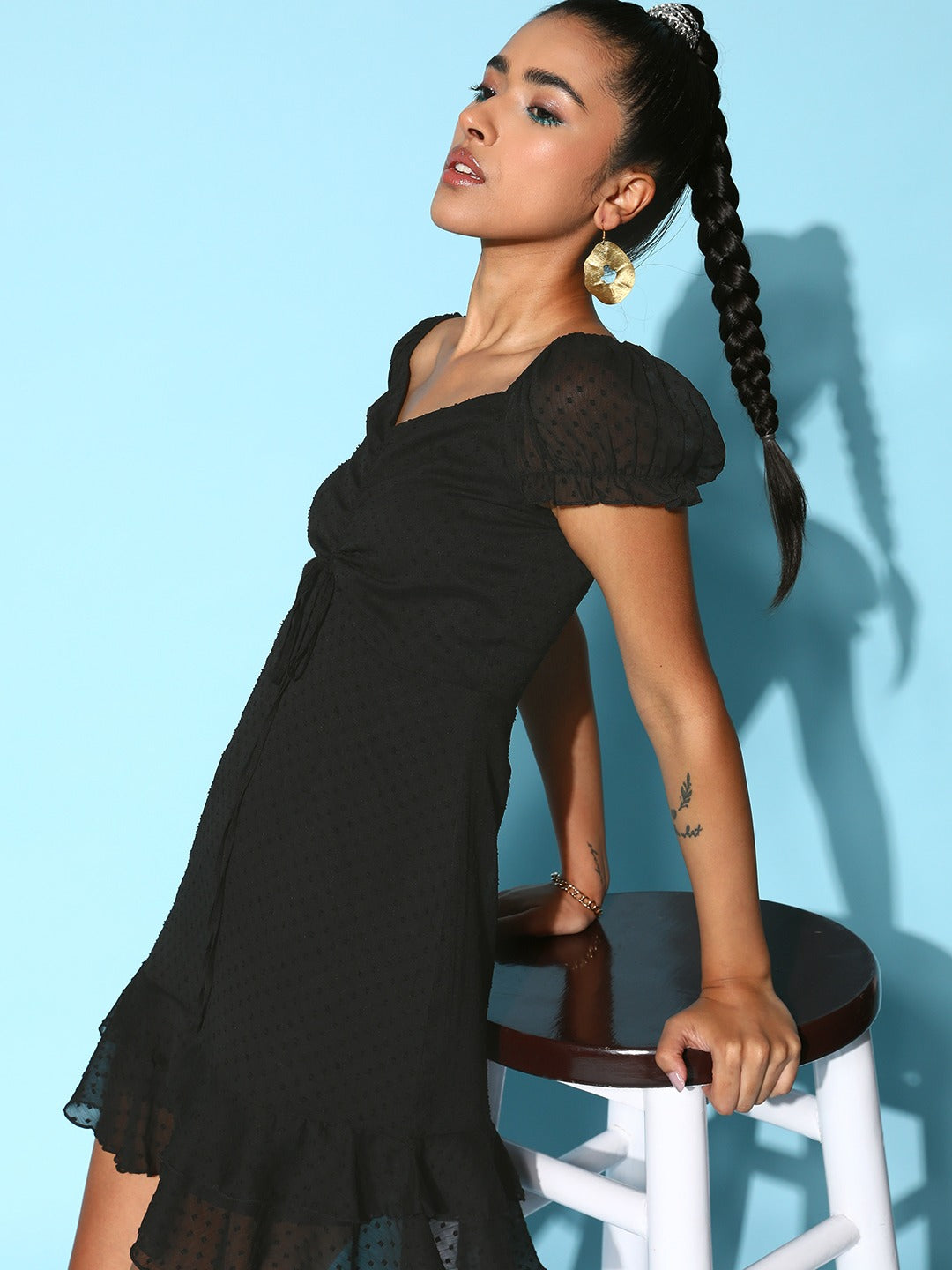 Black is all you need to get the free-spirited and confident aura just like this majestic Solid Black Dobby Weave Sweetheart Neck Georgette Flounce Hem Ruffled A-Line Mini Dress from Berrylush. Spun from georgette polyester fabric to offer this dress a breathable feel with textures touch and semi-sheer detailing. Short-puff sleeves add a tinge of retro charm to this dress with comfortable movements to your arms. Also, the concealed zip closure lends this dress a refined sheen with easy to wear style. You can complete your casual look fabulously by wearing this mini dress with block heels, classy silver jewellery, and a small handbag.
