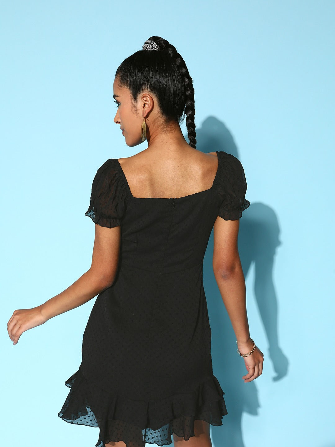 Berrylush Women Solid Black Dobby Weave Sweetheart Neck Georgette Flounce Hem Ruffled A-Line Mini Dress