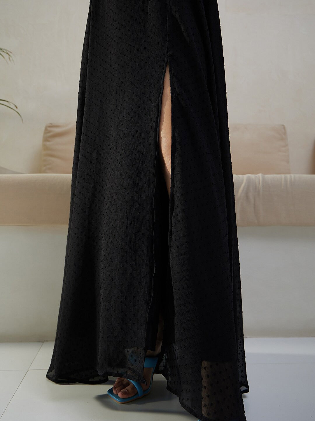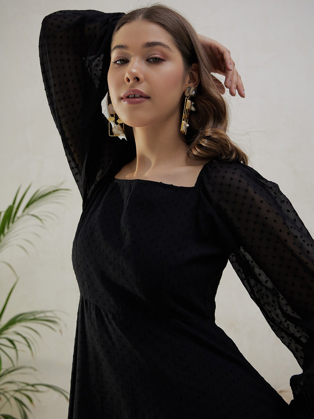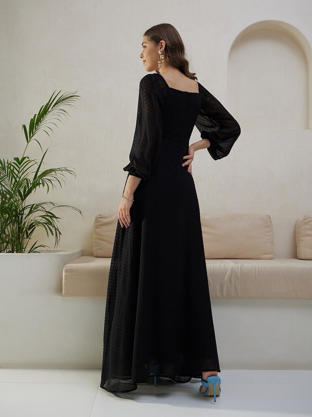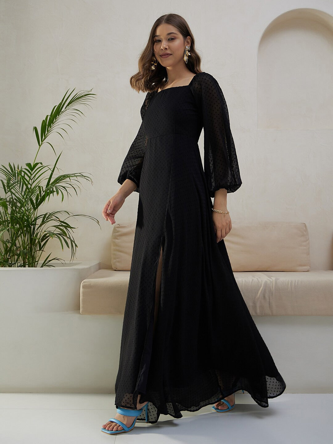 Berrylush Women Solid Black Dobby Weave Square Neck Puff Sleeves Thigh-High Slit Flared Maxi Dress
