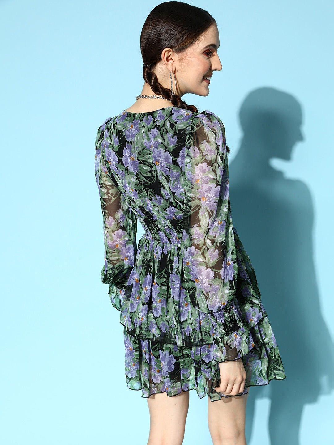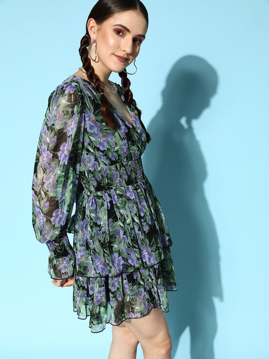Dazzle up your fashion statement with a voguish style by investing in this bedazzling Black & Blue Floral Printed V-Neck Puff Sleeve Layered Wrap Mini Dress from Berrylush. Beautifully tailored with a flared hemline that volume and bouncy drape to this dress. Rendered from the finest georgette polyester material that lends this dress puckered appearance with limitless breathability. Moreover, the woven detailing offers a hint of elasticity and absolute resistance to abrasion. Walk on the street looking stunning by partnering up this mini dress with a pair of block heels, hoop earrings, and a cute purse.