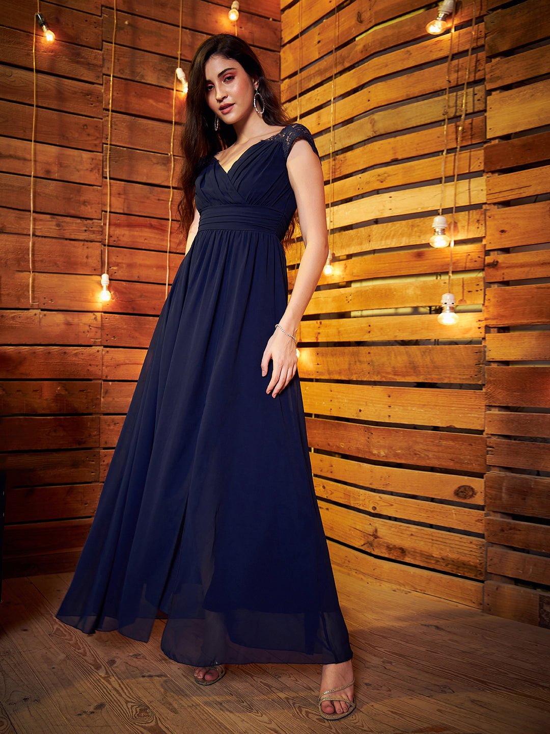 Elevate your style with this Solid Navy Blue Sweetheart Neck Lace-Up Thigh-High Slit Flared Maxi Dress from Berrylush, a perfect blend of comfort and fashion. The most loved element of this dress is its sweetheart neckline which gives your neck an adorable and romantic definition. Detailed with a woven weave to lend this dress shape retention features with a low requirement of maintenance. Moreover, the lace-up surface styling gives this dress a modest and contemporary style statement. Walk on the city streets looking gorgeous by wearing it with black high heels, pearl earrings, and stylish handbags.