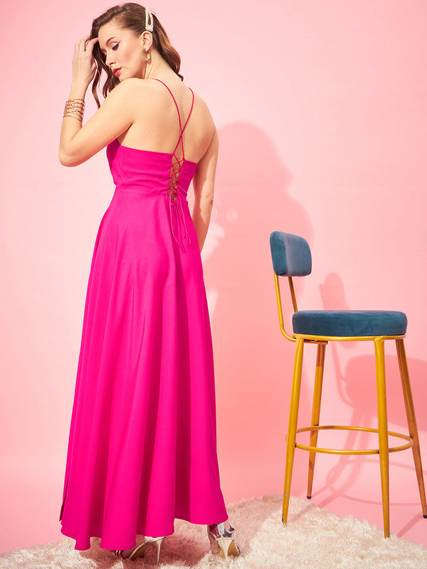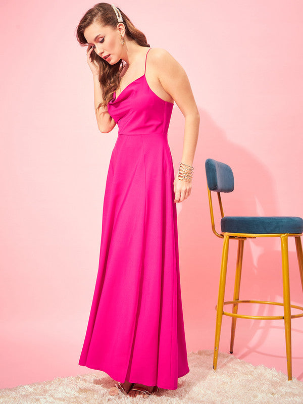 Berrylush Women Solid Pink Cowl Neck Sleeveless Lace-Up Backless Thigh-High Slit Flared Maxi Dress