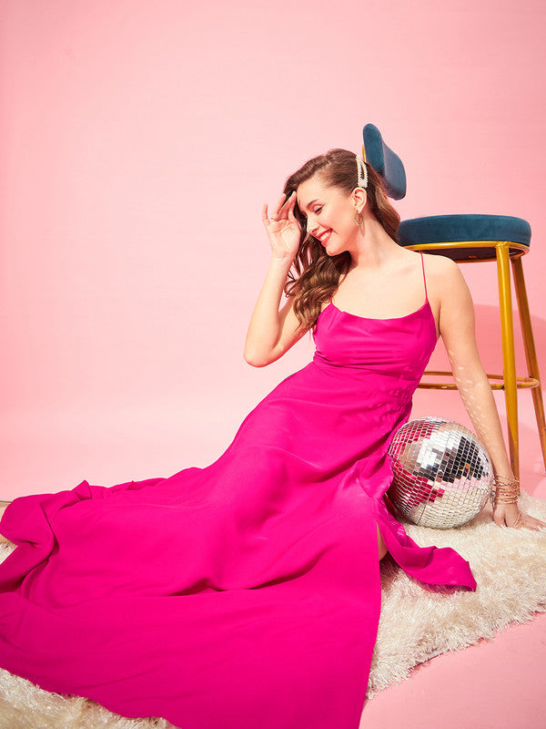 Step into the spotlight with Berrylush's Solid Pink Cowl Neck Sleeveless Lace-Up Backless Thigh-High Slit Flared Maxi Dress, a quintessence of allure and elegance. Tailored from luxuriously soft polyester fabric, this exquisite piece promises not just comfort but a graceful drape that flatters your every move. Featuring sophisticated detailing like the seductive thigh-high slit and enchanting backless design with an exquisite lace-up finish, it ensures you're the centre of attention at any party. The dress's vibrant pink hue amplifies its allure while maintaining an air of refined sophistication through its solid pattern and opaque transparency. Embrace timeless style combined with modern charm; let this maxi dress by Berrylush become your go-to for unforgettable moments.