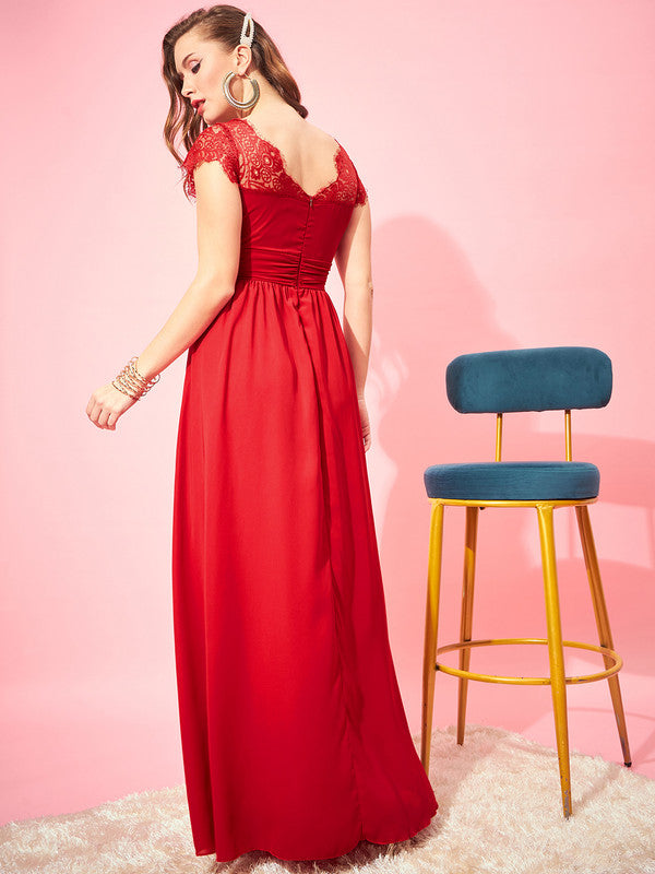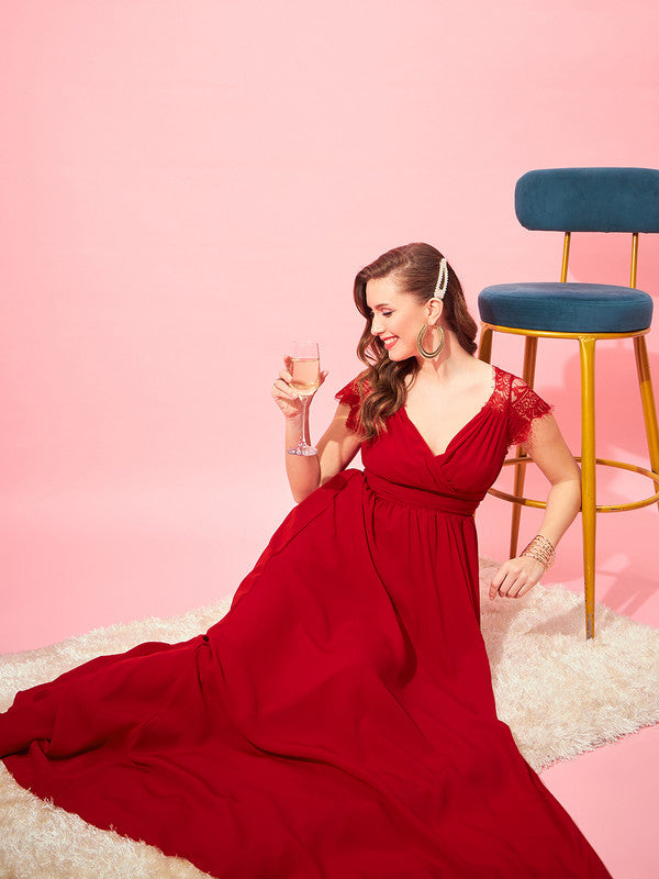 Berrylush Women Solid Red V-Neck Lace Inserts Thigh-High Slit Flared Maxi Dress