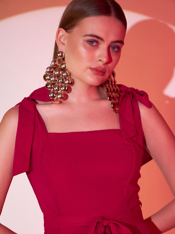 Step into the spotlight with Berrylush's Solid Red Square Neck Waist Tie-Up Cutout Georgette Thigh-High Slit Flared A-Line Maxi Dress. This stunning piece, crafted from luxurious woven polyester and equipped with a sleek georgette fabric, is designed to set you apart at any party. The bold red hue captures attention, while the elegant square neckline and sleeveless design add a touch of sophistication. Featuring an enticing thigh-high slit and flirty cutouts tied gracefully at the waist, this maxi dress flows beautifully into a flared hemline for effortless movement. Perfectly lined for comfort without sacrificing style — this dress promises a look that’s both captivating and classy.