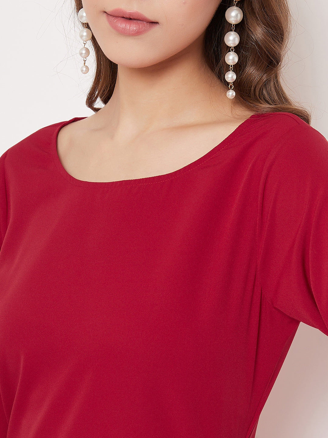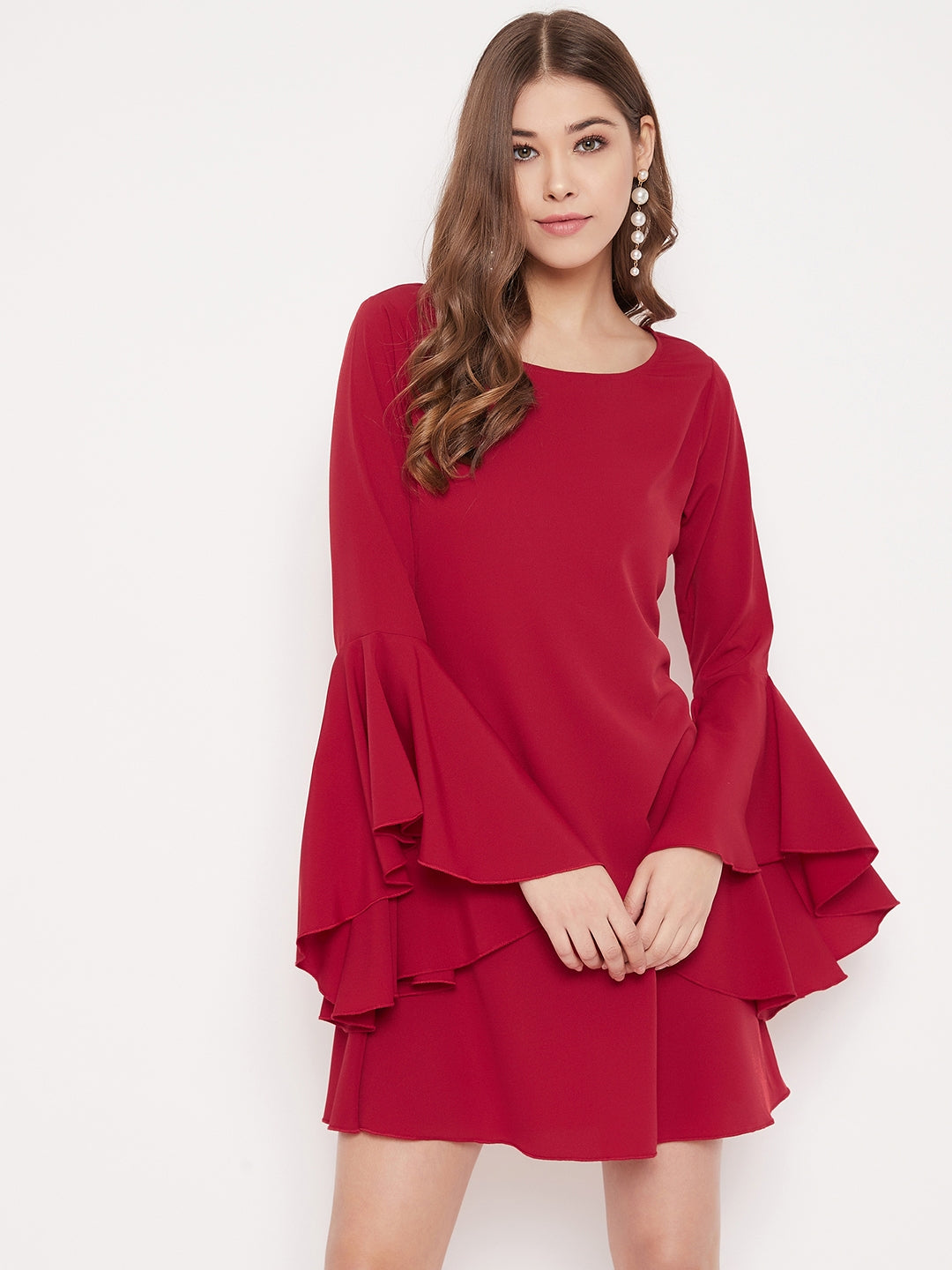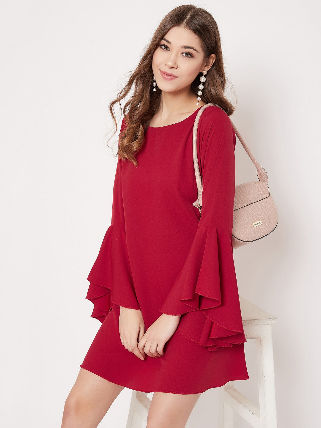 This Berrylush Solid Red Flared Sleeves A-Line Mini Dress is crafted for a charismatic persona like you. Embrace this natty outfit and head confidently for your casual outing. Bring the iconic pristine fashion culture and provoke the crowd to follow in your footsteps. Luxury red colour with flattering flared sleeves makes you look stylish & gorgeous. Embrace the season's most appreciated round neckline mini dress with polyester smoothness that takes you to another level. Blush like a raspberry with Berrylush's seductive ruffle A-line mini dress that flaunts your beauty and glorifies your special date look with high-heeled stilettos. Buy the luxurious red mini dress from Berrylush and show love with passion.