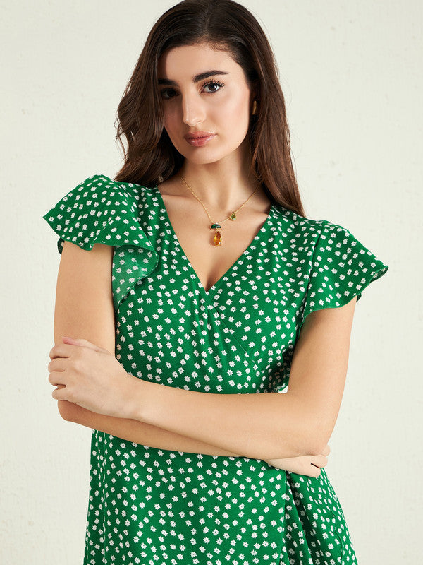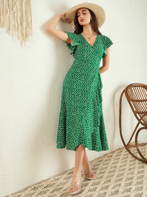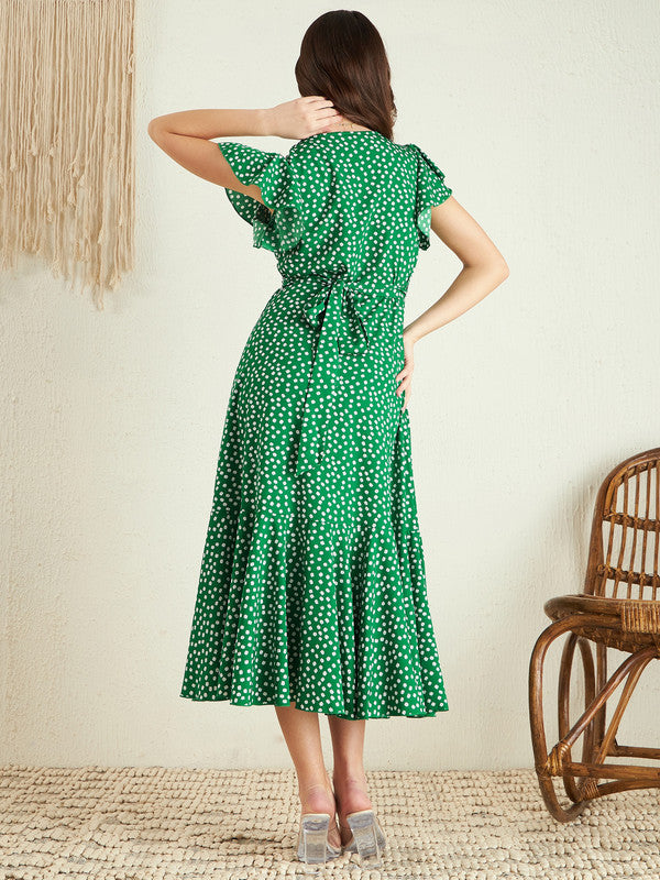 Berrylush Women Green & White Floral Printed V-Neck Flutter Sleeve Waist Tie-Up Straight Hem Wrap Midi Dress