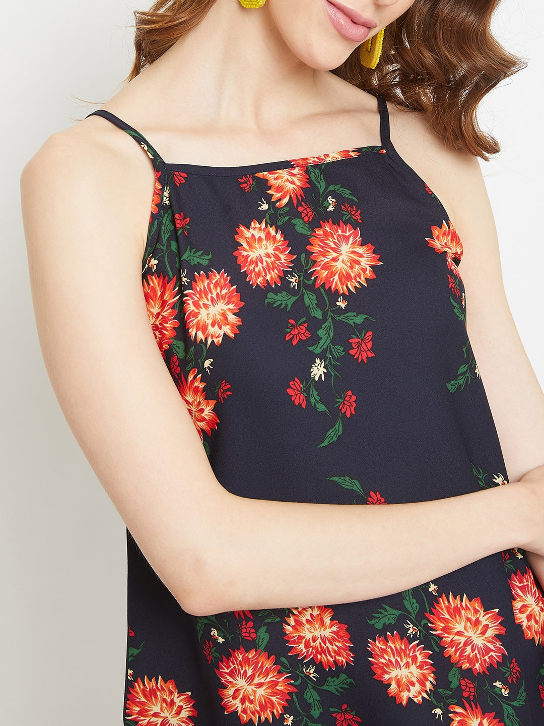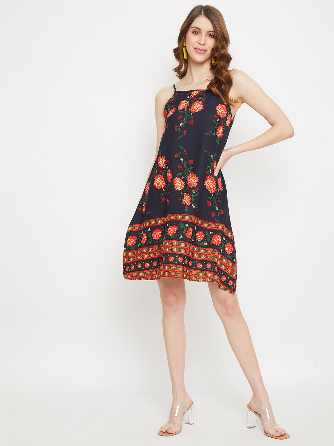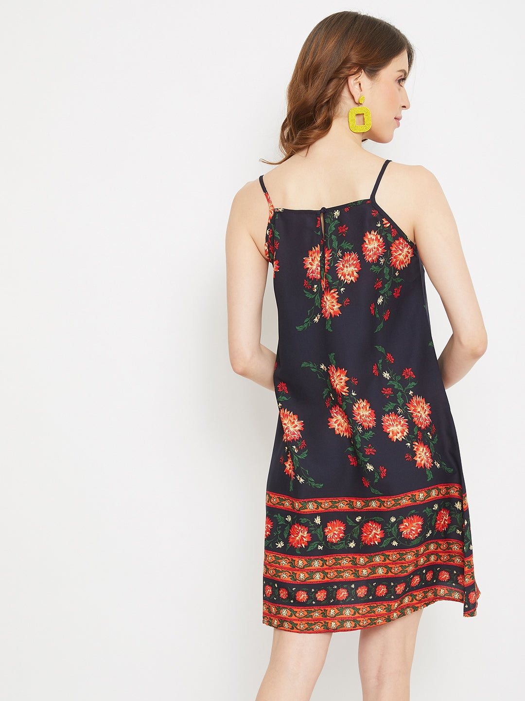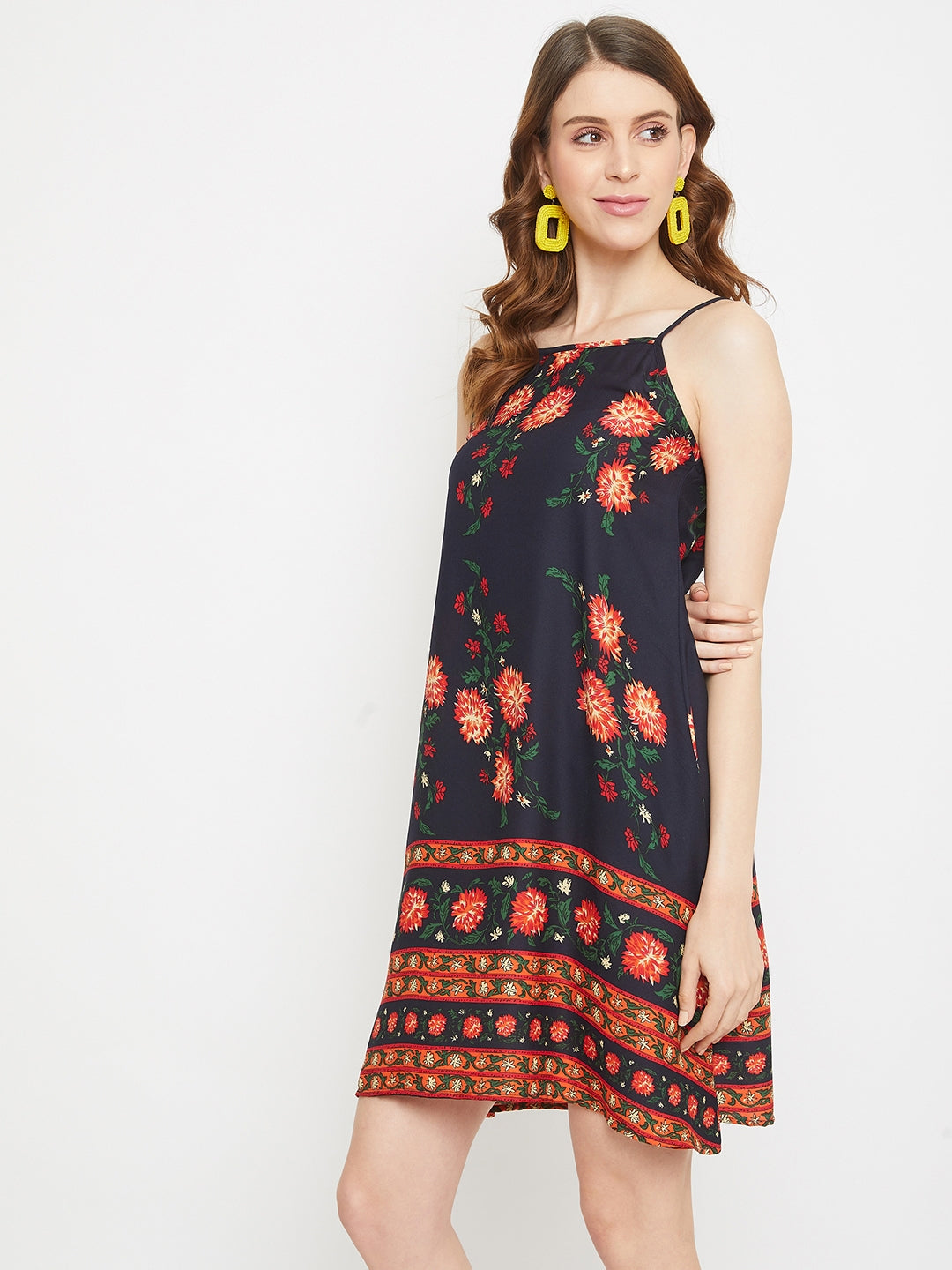 Berrylush Women Navy Blue Floral Printed Sleeveless Halter Dress