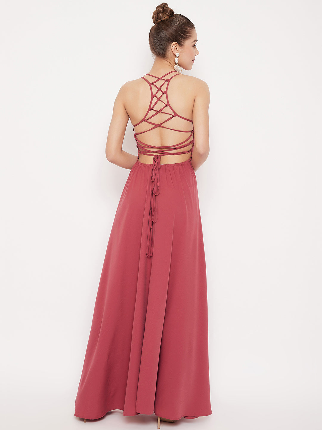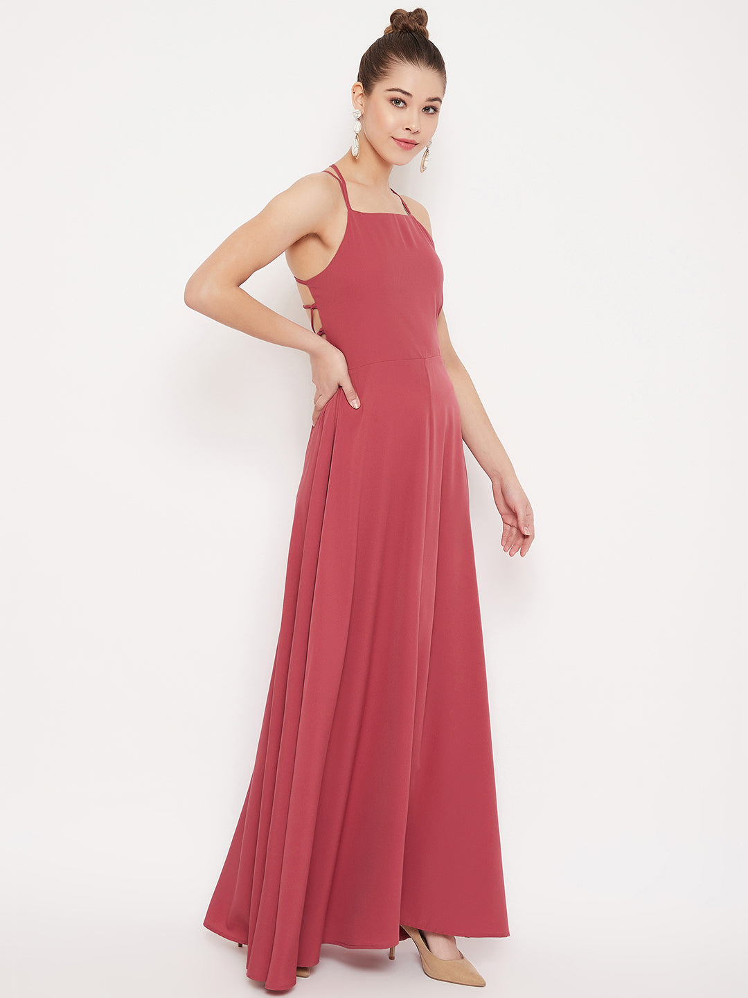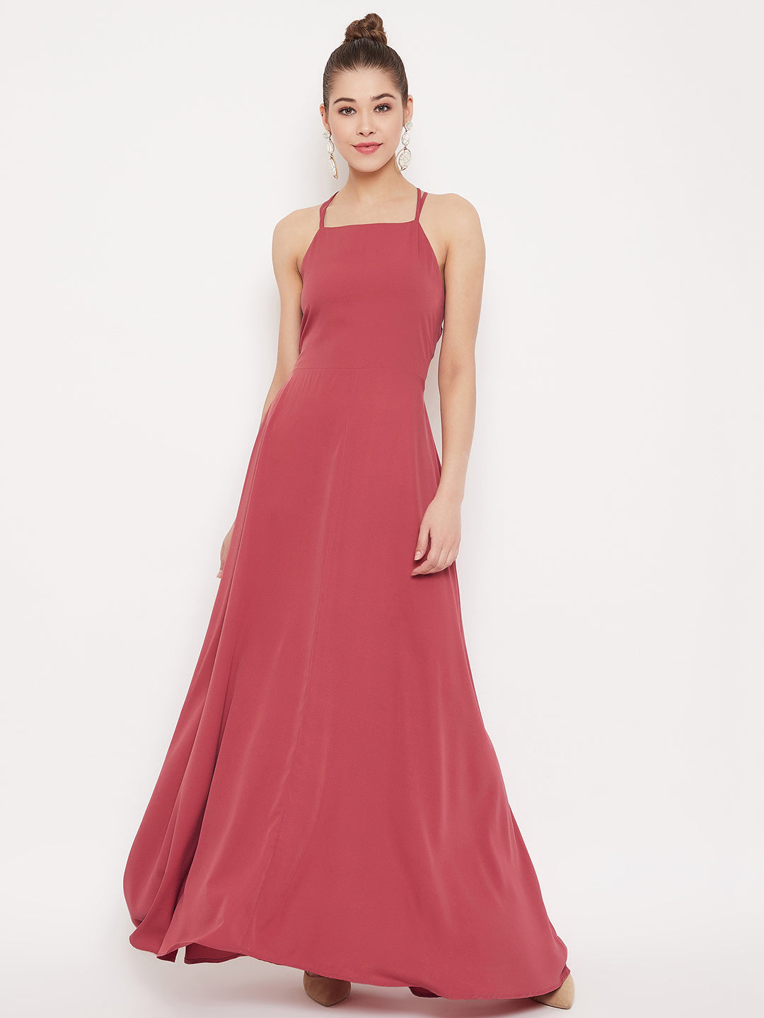 Berrylush Women Solid Pink Caged Back Halter Neck Maxi Dress