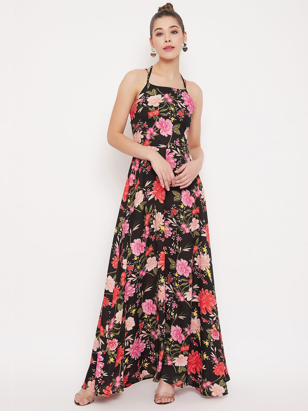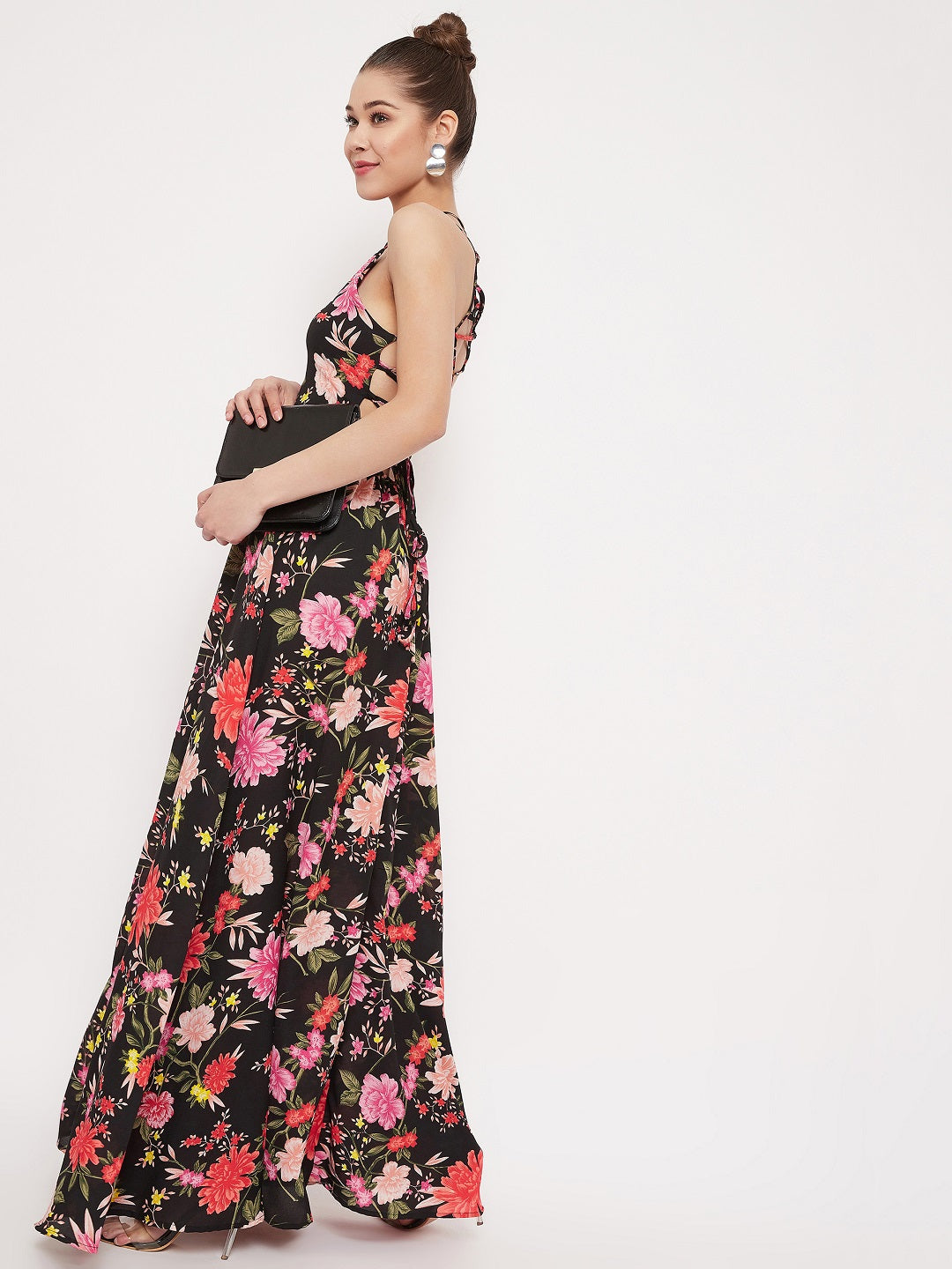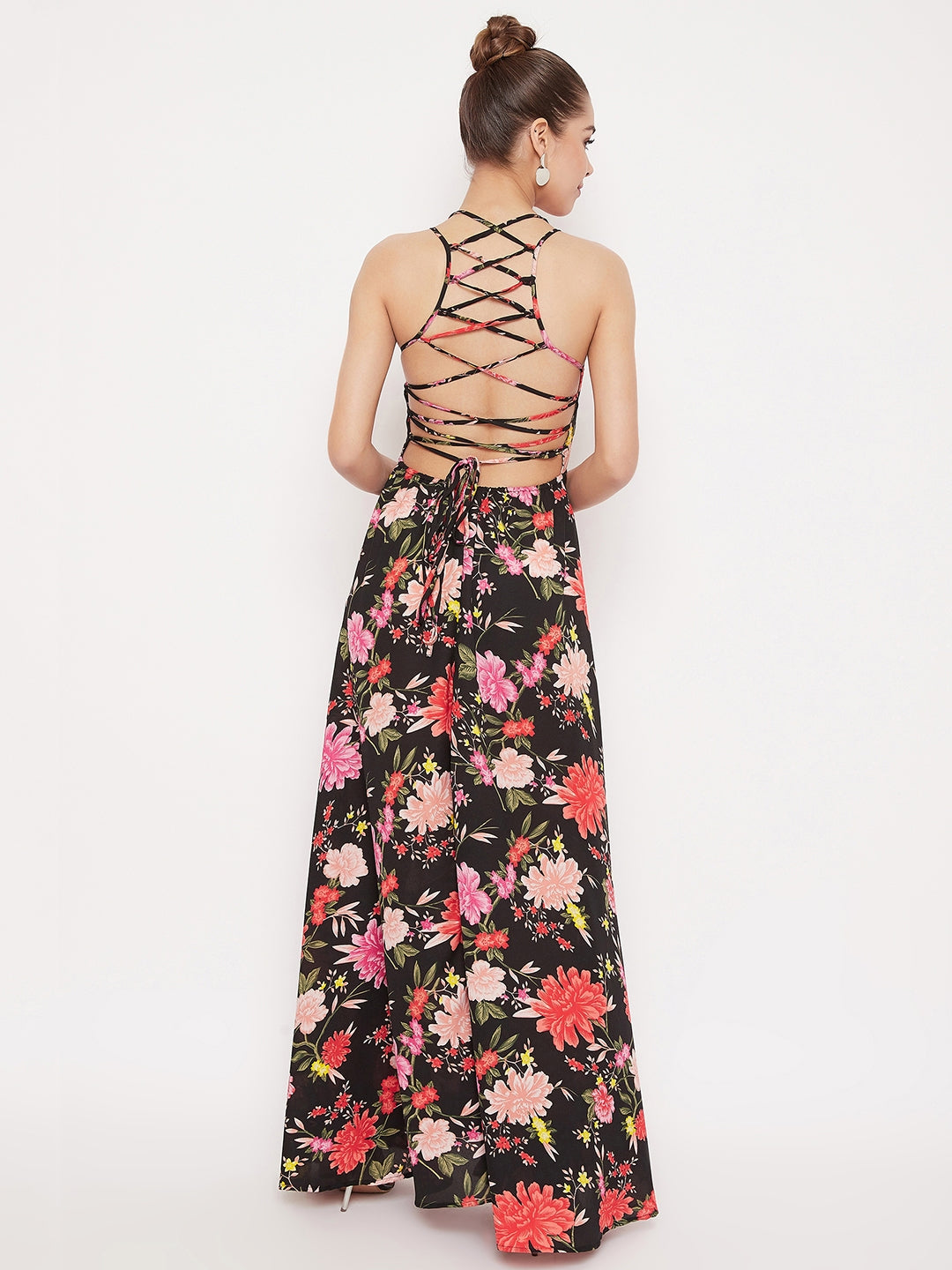 Berrylush Women Black Floral Printed Tie-Up Backless Maxi Dress