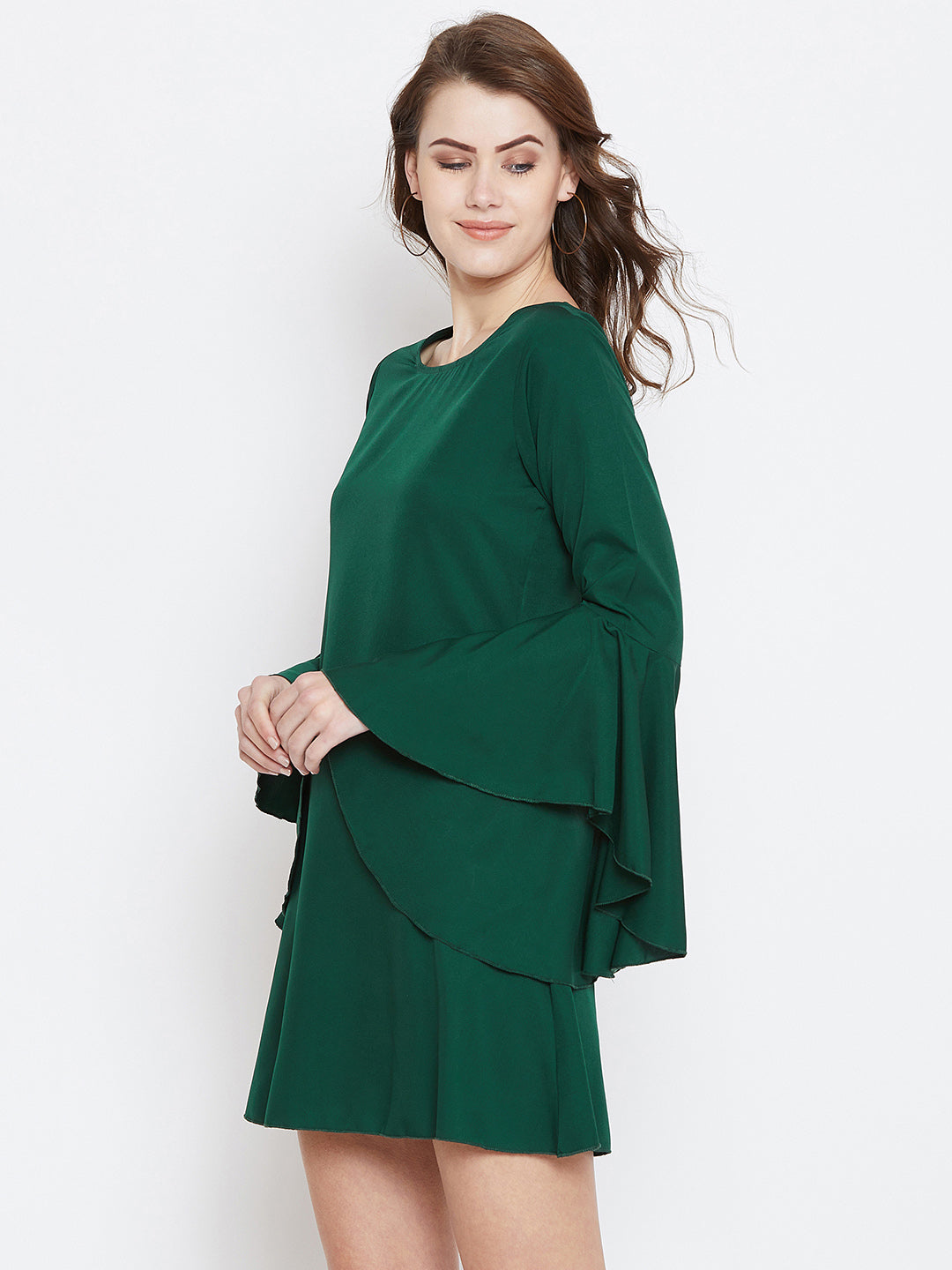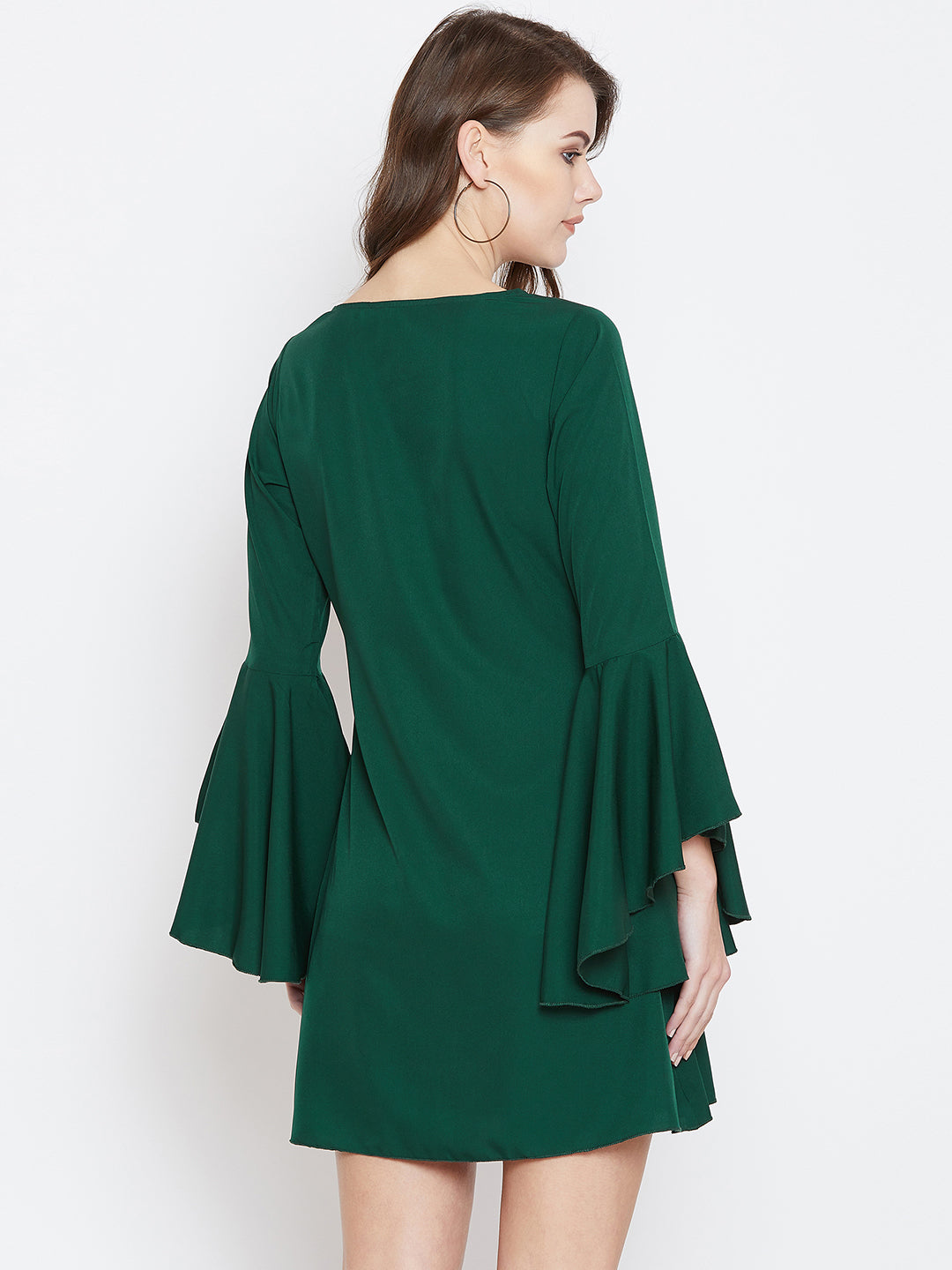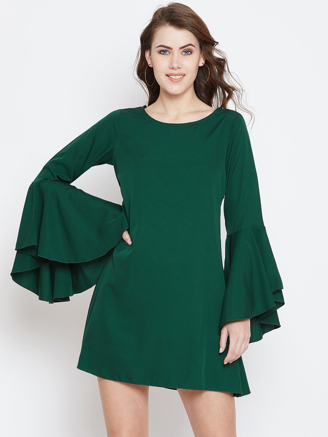 Berrylush Women Solid Green Round Neck Bell Sleeves A-Line Mini Dress