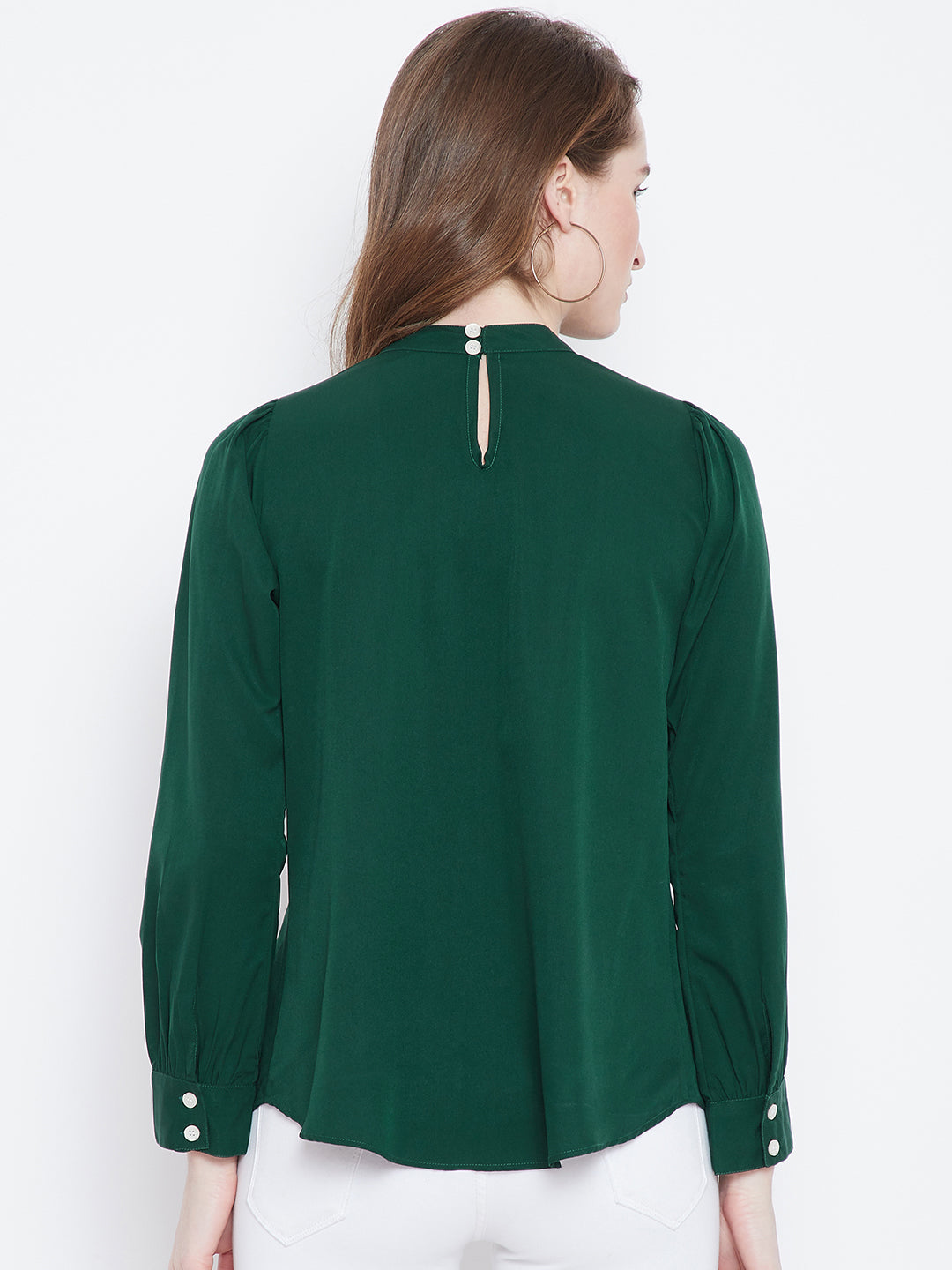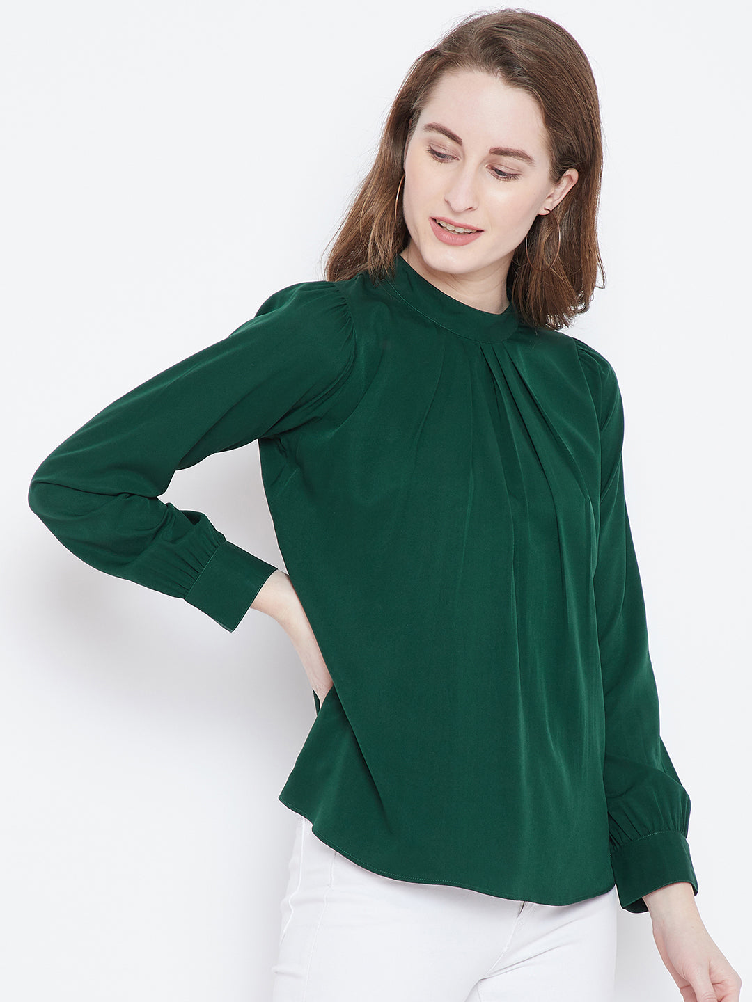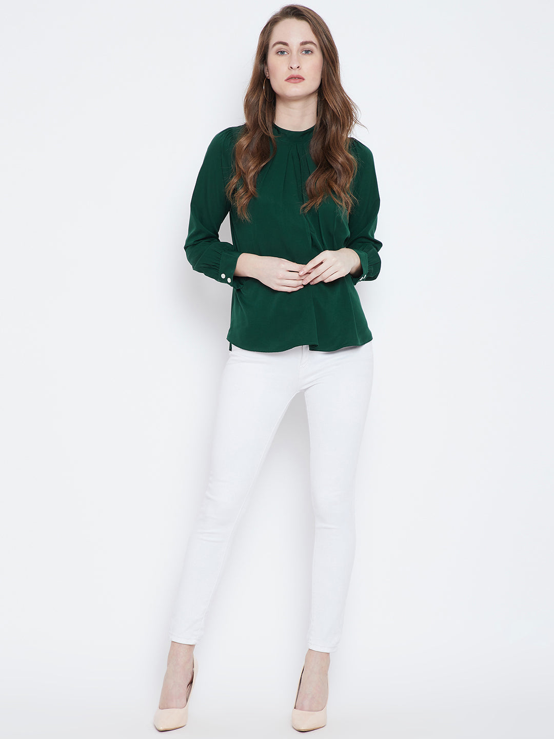Maintain a classy and trendy look all year long by treating your wardrobe with this Solid Green Mandarin Collar Neck Button-Up Pleated Regular Top introduced by Berrylush. This dress keeps your workwear collection up-to-date with the mesmerizing mandarin collar design which gives a practical and versatile texture to your neckline. The long cuffed sleeves offer volume to your arms along with an attractive frame. The cinematic combination of green shade and solid pattern gives away a refreshing and vintage vibe from your casual look. Wear this charming pleated top with white fitted trousers, block heels, and a stylish handbag to get a sophisticated look.