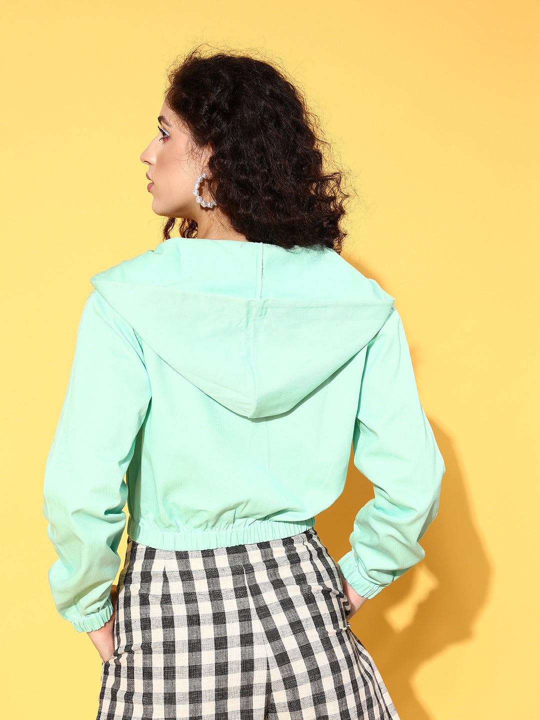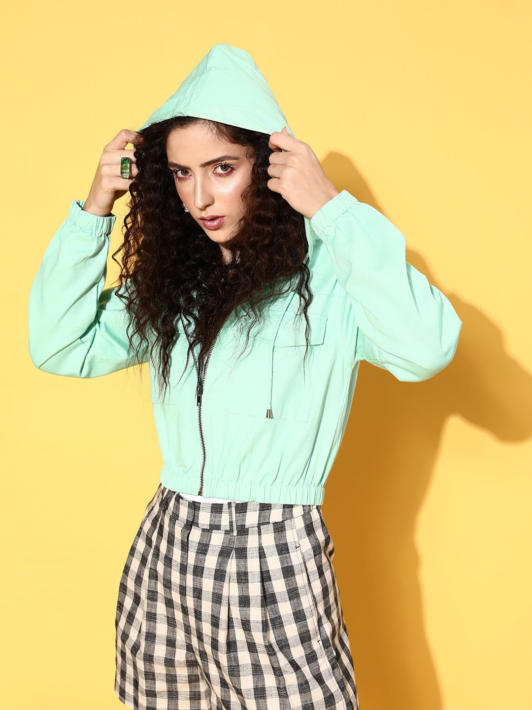 Berrylush Women Solid Green Hooded Neck Zipper-Up Straight Hem Regular Jacket