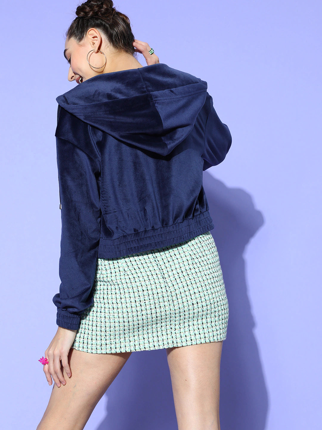 Berrylush Women Solid Navy Blue Hooded Front Zipper Straight Hem Crop Bomber Jacket