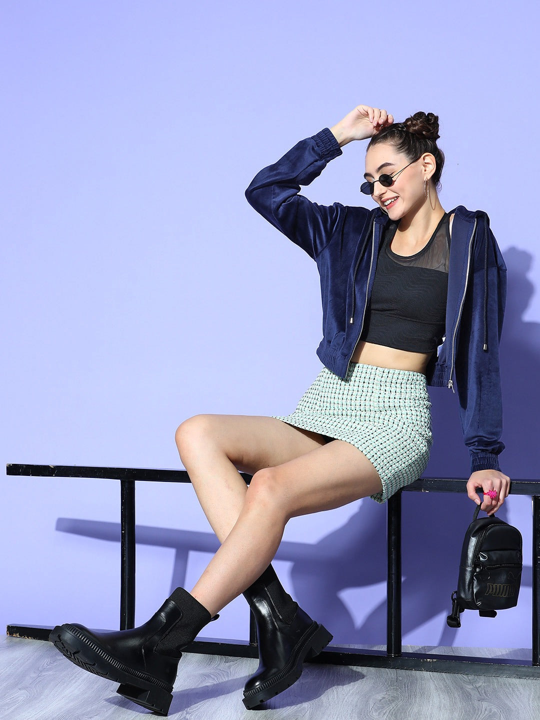 Welcome the autumn season with a splash of vibrant and royal colour by investing in this sassy Navy Blue Solid Crop Bomber Jacket from the latest winter collection of Berrylush. Punctuated from the finest polyester material enables this jacket retains warmth with blockage of airflow. Designed in crop length to give this jacket a fashion-flattering appeal without a bulky or heavy look. Moreover, this jacket comes with a zip closure on the front to support an easy-to-wear style with a decorative sheen. Layer up this bomber jacket with a fitted top, a mini skirt, a pair of black ankle-length boots, silver earrings, and a trendy black handbag for a captivating look.