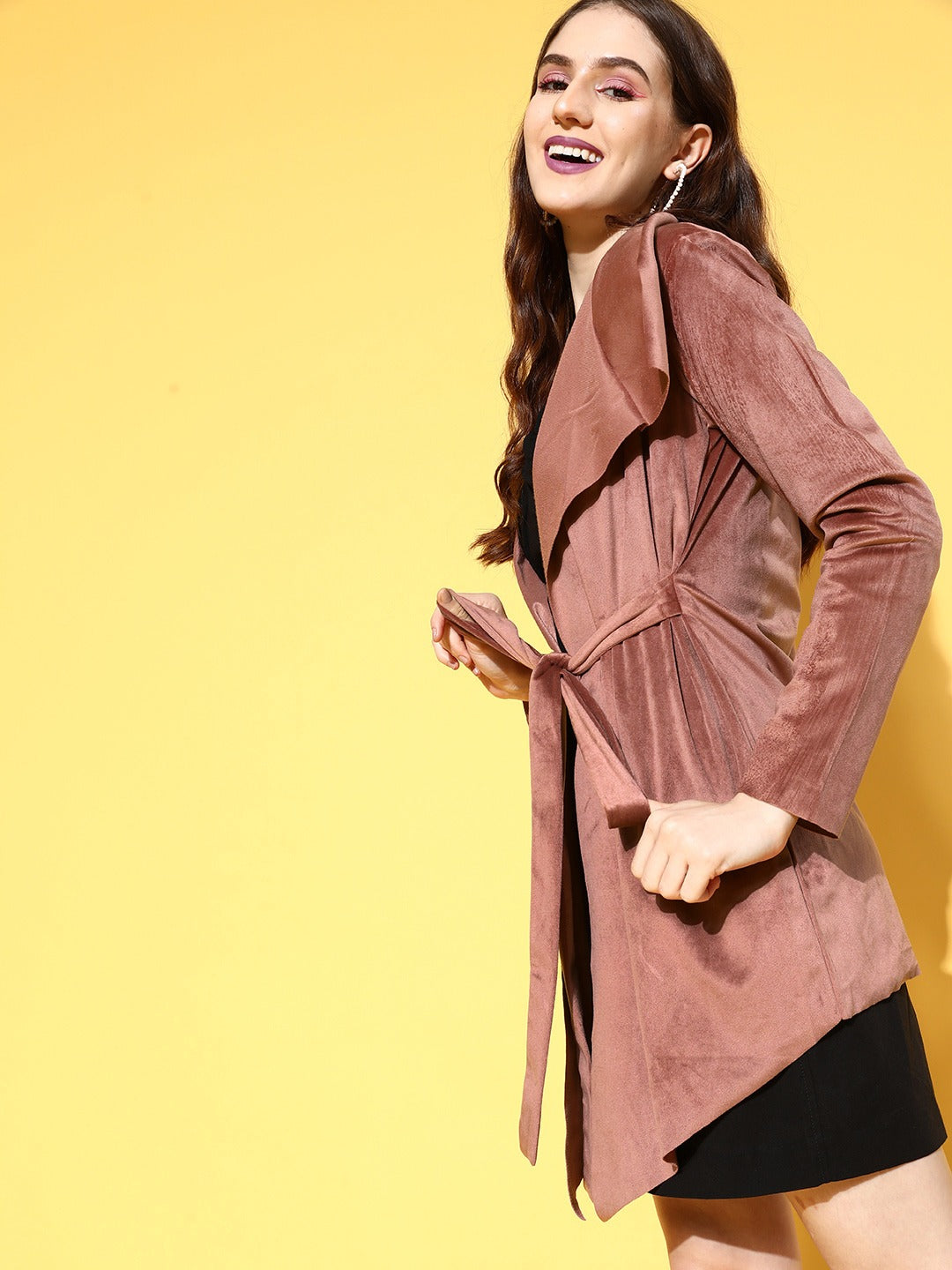 Berrylush Women Solid Brown Shawl Collar Neck Tie-Up Waist Wrap Coat