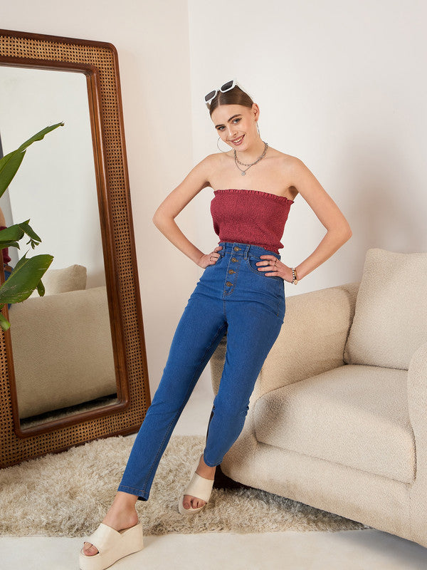 Elevate your casual wear with Berrylush's Solid Blue High-Rise Waist Cotton Jeans, ideal for everyday elegance. Crafted from soft knitted cotton fabric, these jeans ensure comfortable all-day wear with a snug slim fit that highlights your silhouette beautifully. Featuring four practical pockets and belt loops for styling versatility, the jeans are secured with a classic button and zipper closure - offering both convenience and chic detail. Designed in a medium blue shade that exudes subtle charm while remaining opaque, this staple piece promises to be both stylish and functional in your wardrobe.