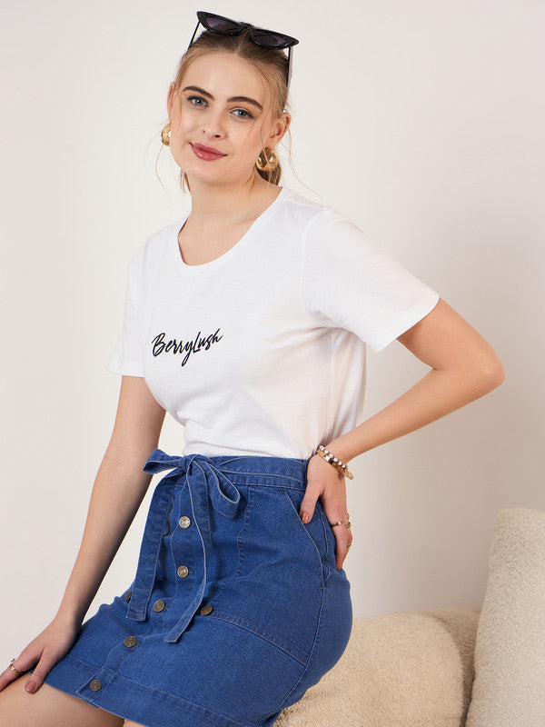 Introducing the Berrylush Solid Blue Denim Mini Skirt – your go-to for effortless chic. This mini A-line skirt, in a vibrant blue hue, offers both style and comfort with its high-rise waist and flattering straight hemline. Made from soft knitted denim, it features a unique front tie-up and button closure ensuring a perfect fit every time you slip into it. Ideal for causal outings, this opaque skirt boasts two handy pockets adding functionality to its fashionable silhouette. Elevate your wardrobe with this versatile piece that promises to keep you stylish on any casual occasion.