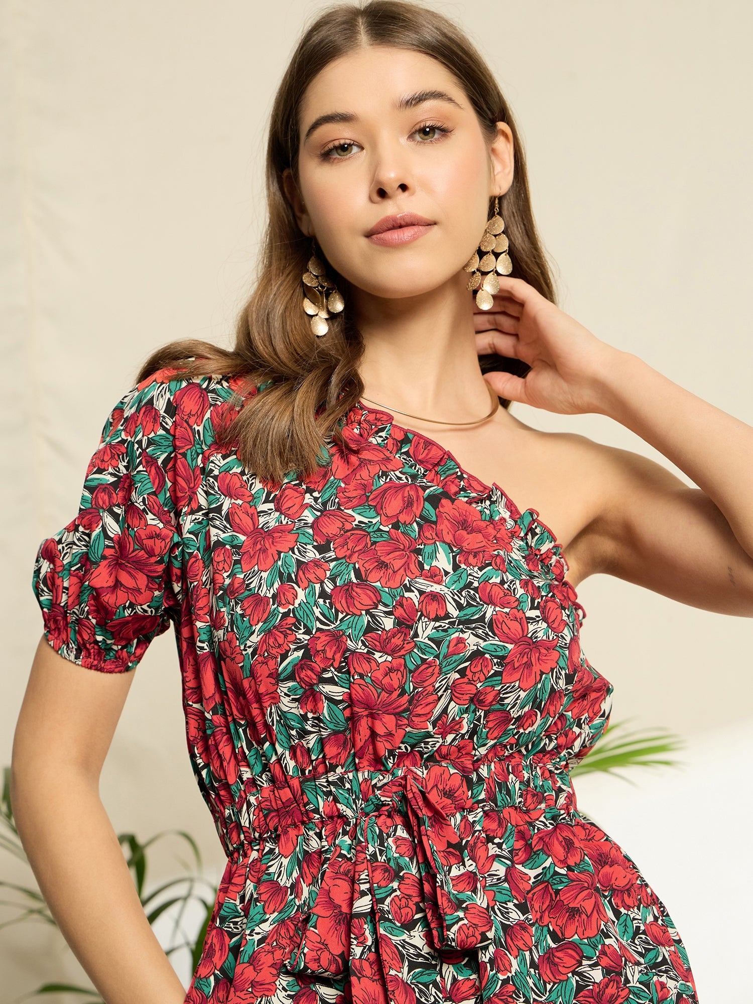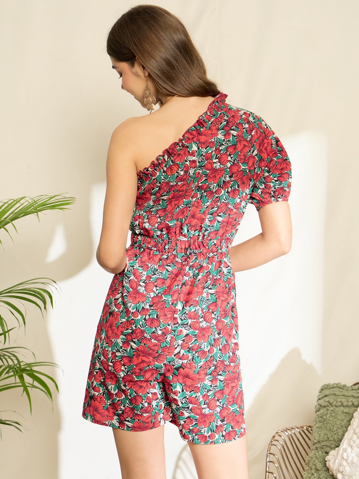 Berrylush Women Red & Green Floral Printed One-Shoulder Neck Puff Sleeve Tie-Up Waist Ruffled Mini Romper