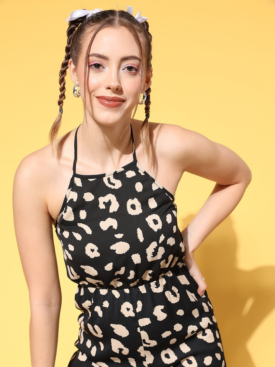 Bolster your casual range with playful and chic addition by investing in this charming Black and Beige Animal Printed Halter Neck Sleeveless Mini Jumpsuit from Berrylush. Decked with a captivating beige animal print in a black shade that lends this jumpsuit an eye-catching design with a ritzy vibe. Fashioned with a sleeveless design that gives your arms an enticing disclosure with a comfy feel. Moreover, the mini length makes this jumpsuit appear alluring while keeping your legs cool on hot summer days. Create a fashion-forward look for your weekend outing by wearing it with a pair of cute sandals, floral earrings, a straw hat, and a waist bag.