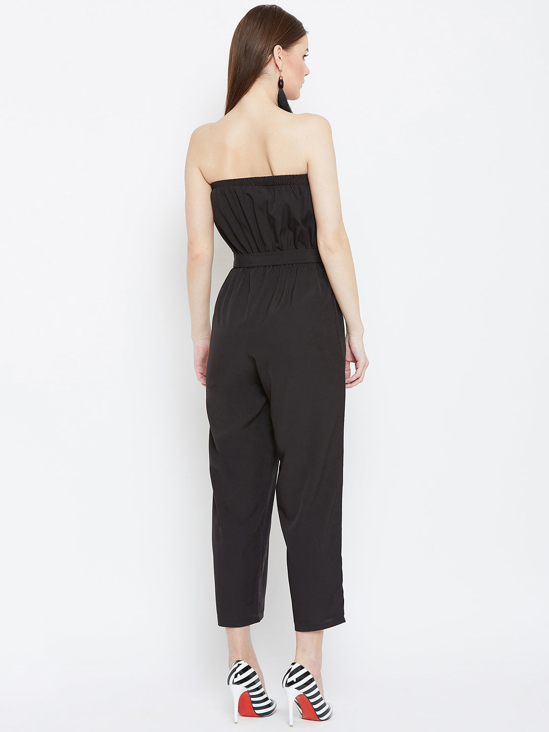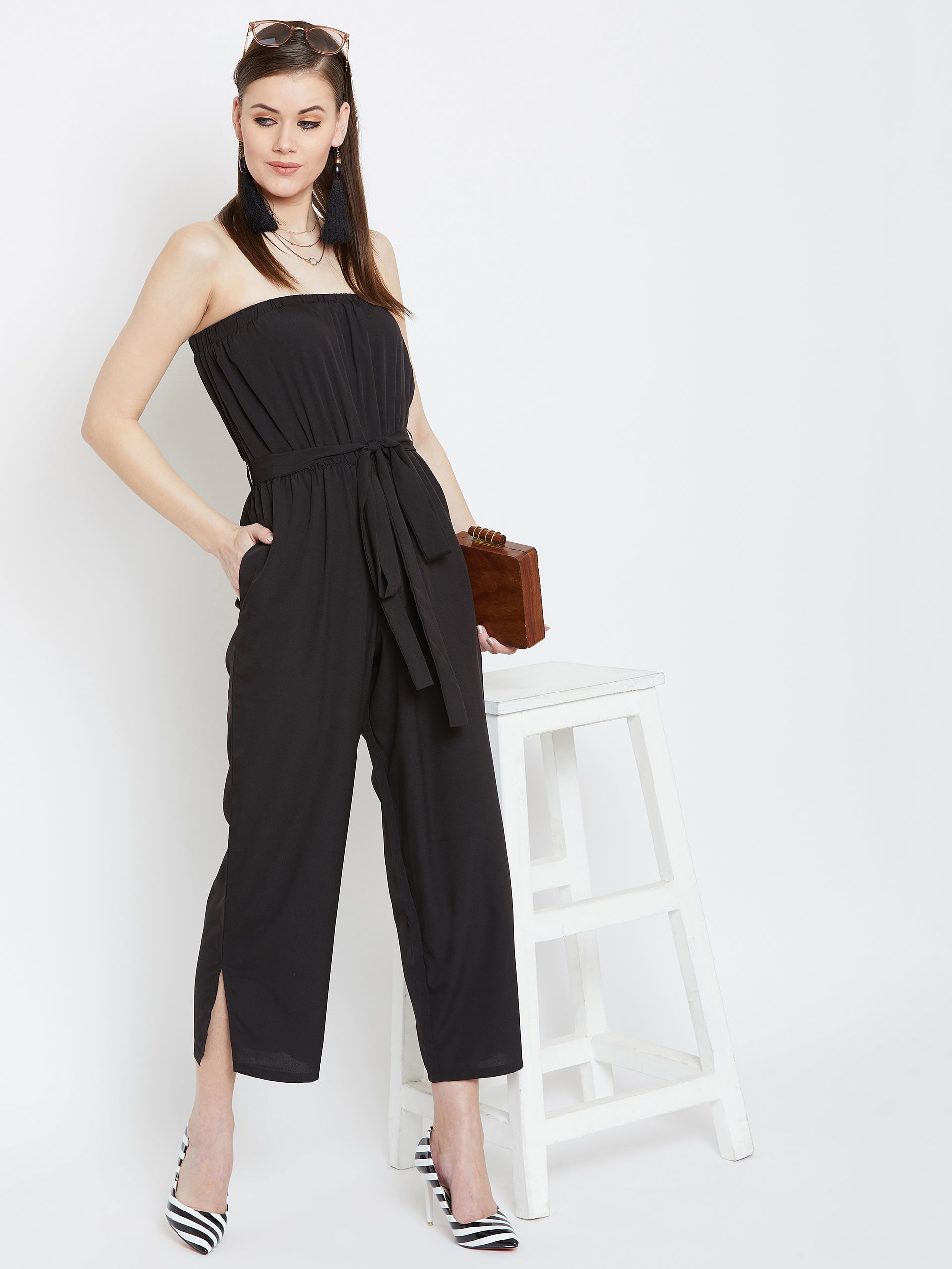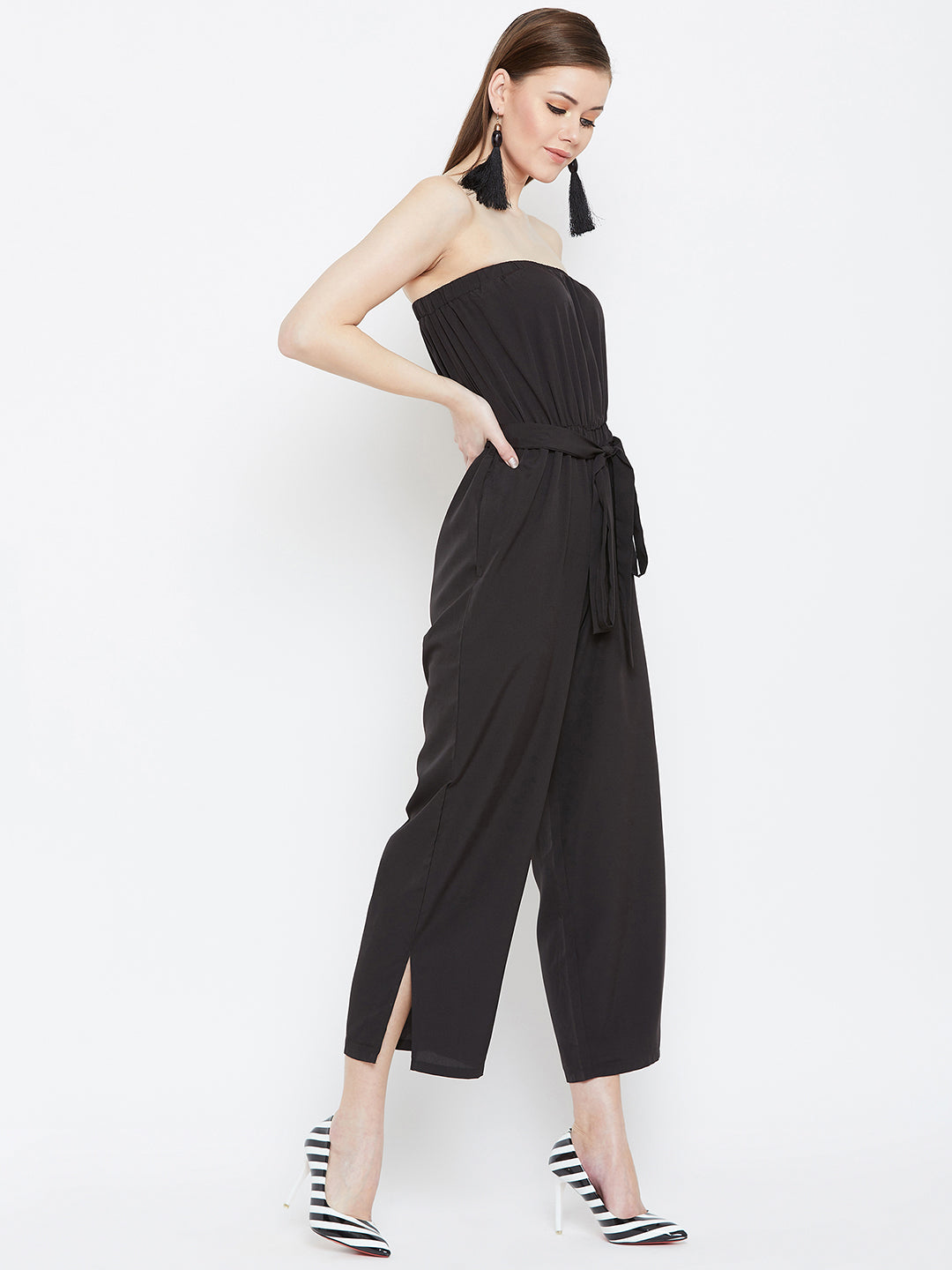 Berrylush Women Solid Black Off-Shoulder Waist Tie-Up Slited Jumpsuit