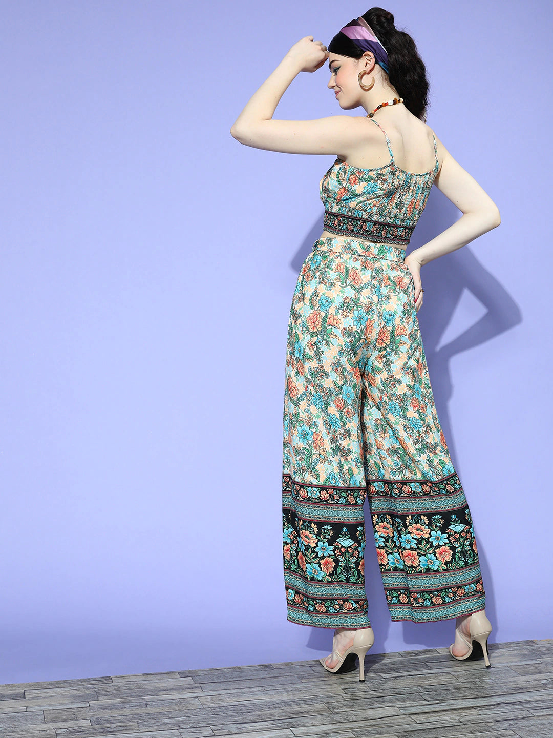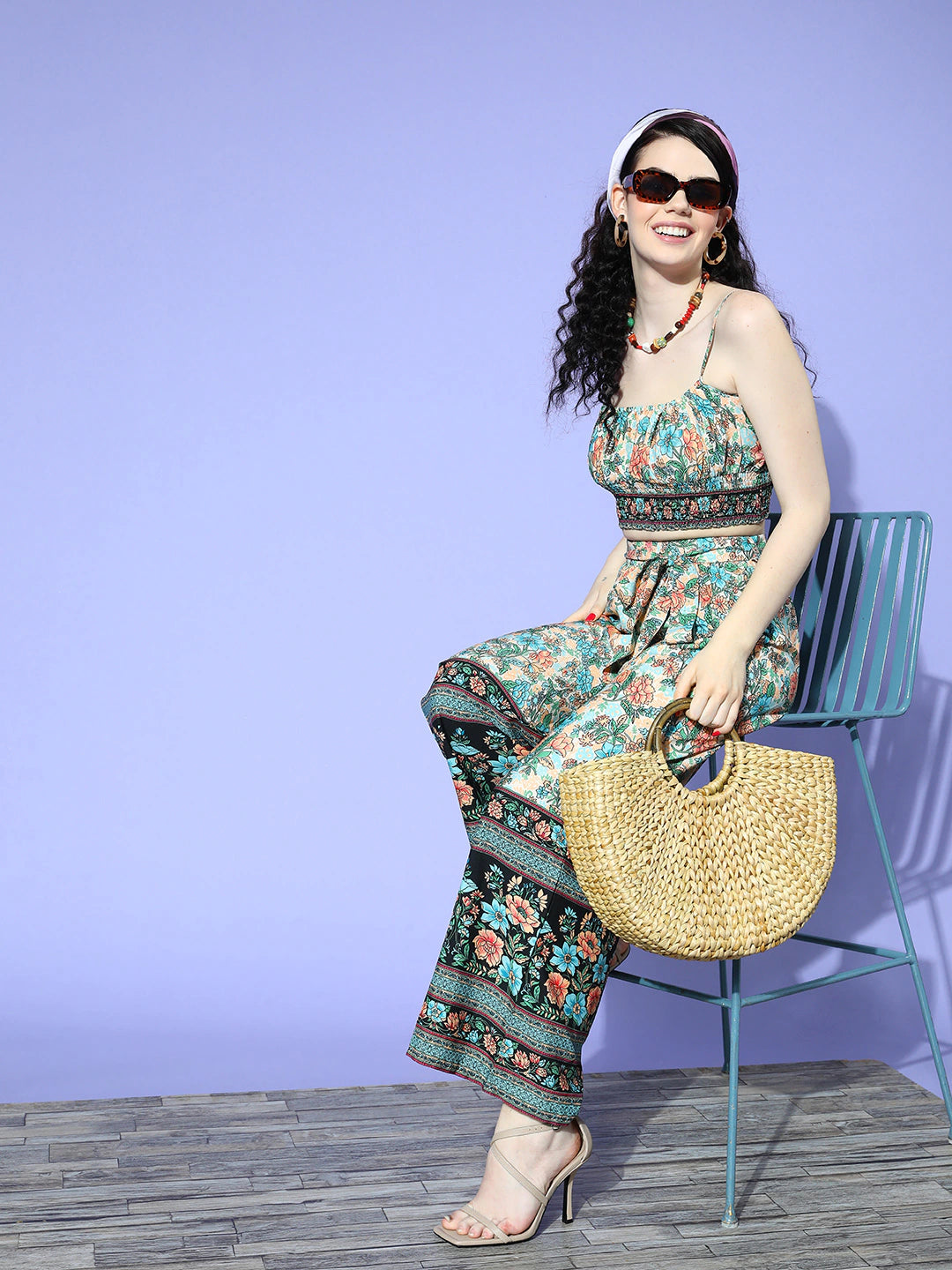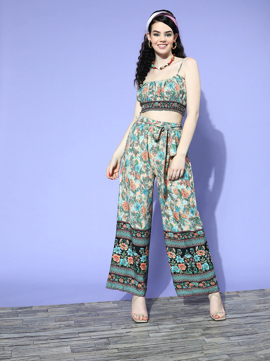 Berrylush Women Multicolour Floral Printed Round Neck Waist Tie-Up Crop Top & Wide-Leg Trousers Set