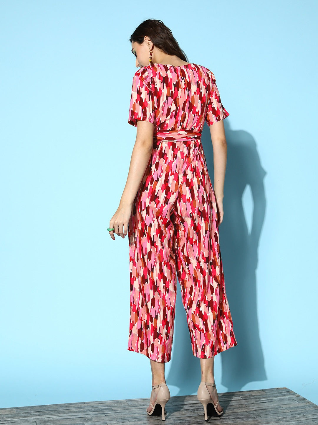 Berrylush Women Pink Abstract Printed Round Neck Tie-Up Waist Wide Leg Regular Jumpsuit