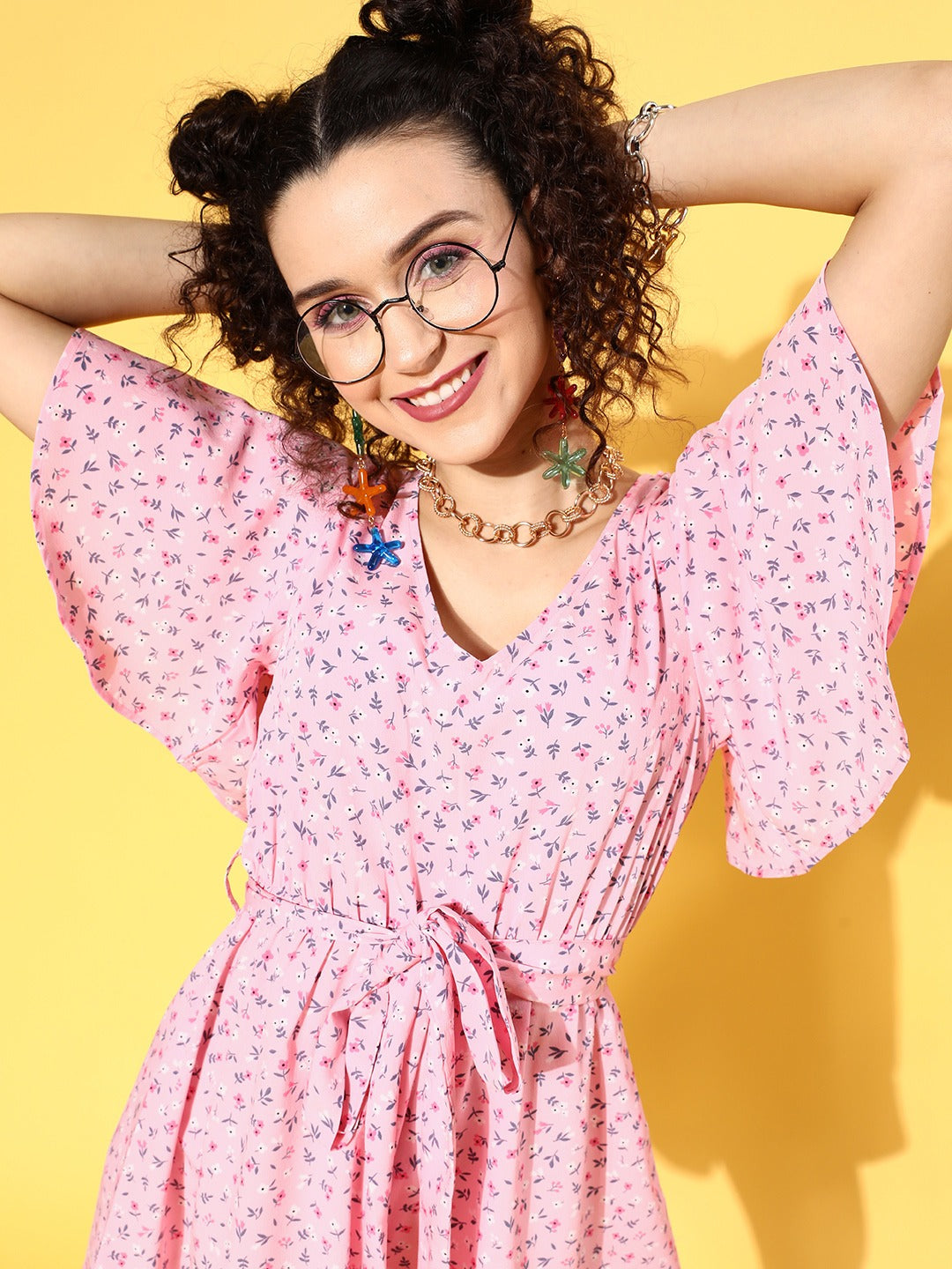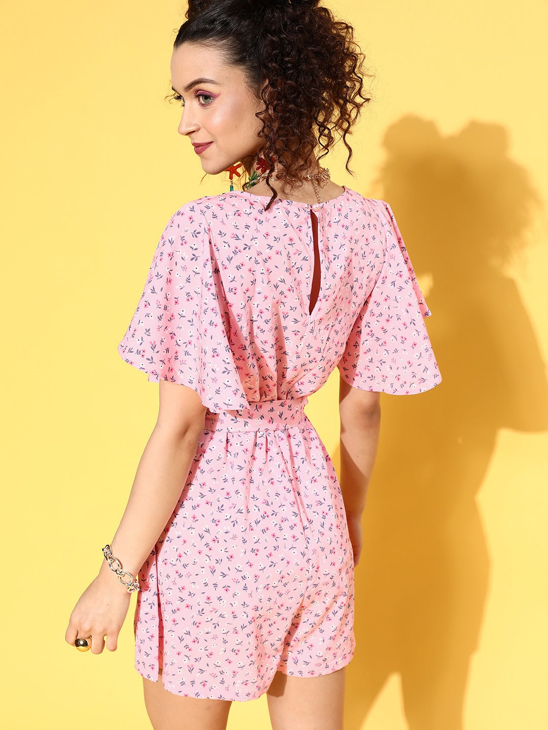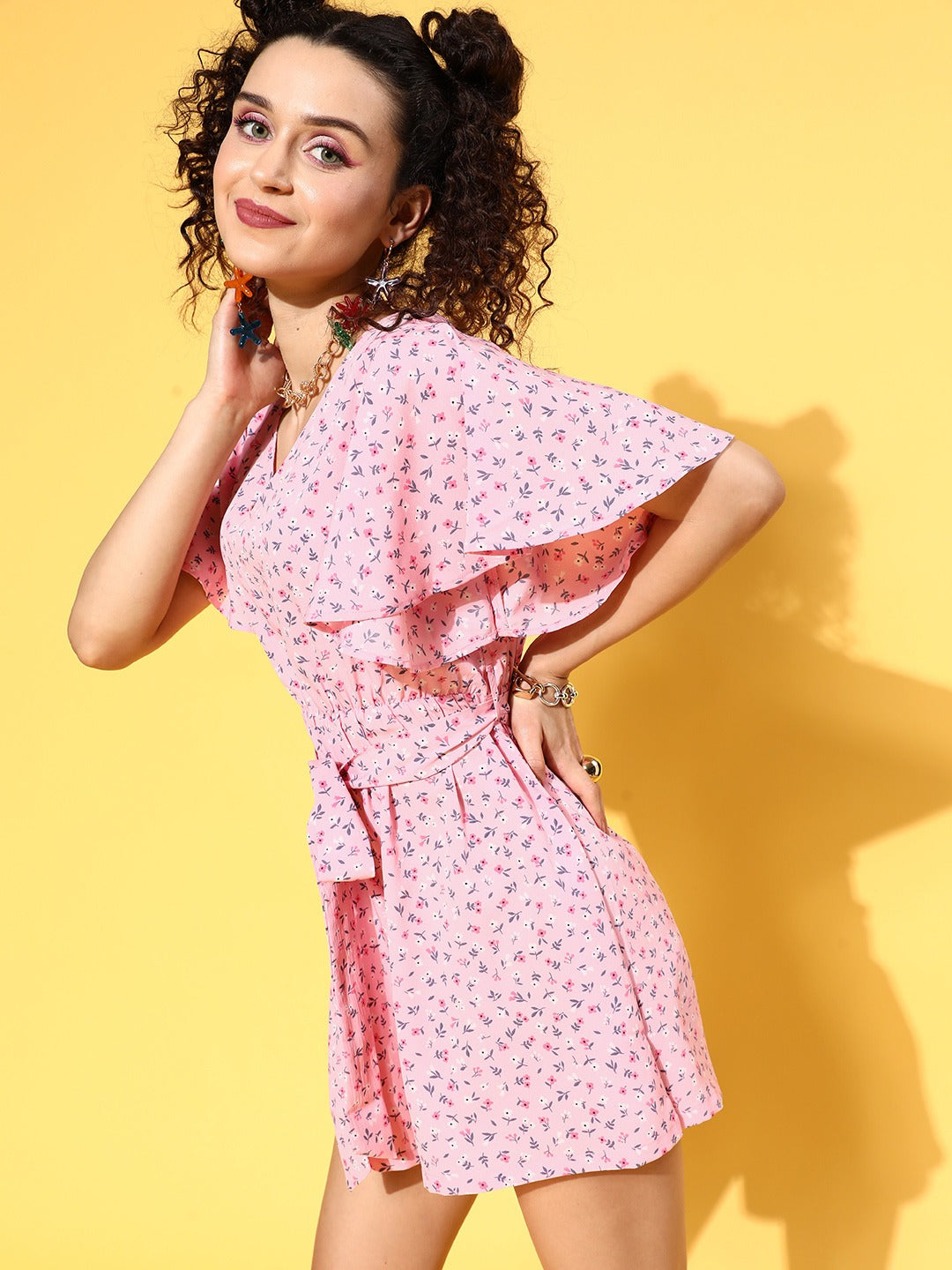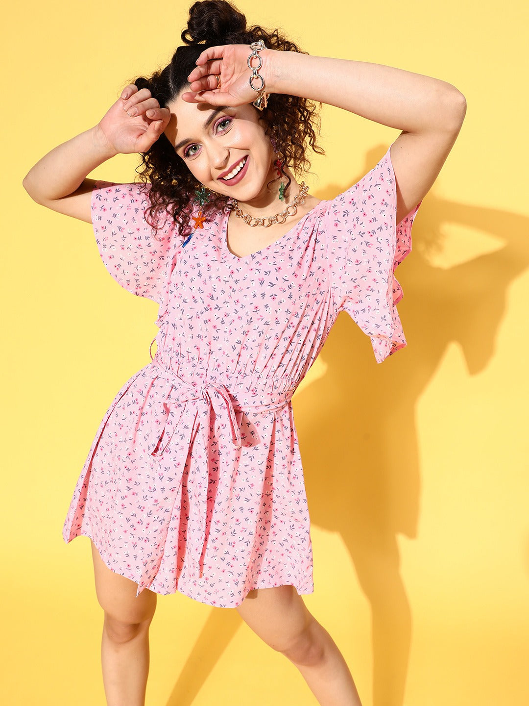 Berrylush Women Pink Floral Printed V-Neck Waist Tie-Up Ruffled Mini Jumpsuit