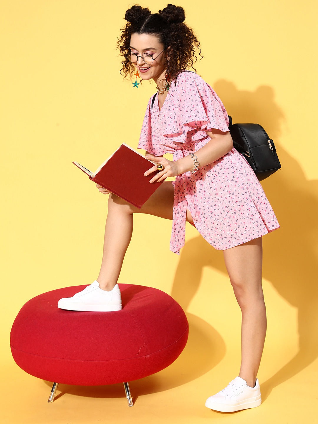 Gift your summer casual closet a perfect amalgam of chic fashion elements with this cute Pink Floral Printed V-Neck Waist Tie-Up Ruffled Mini Jumpsuit from Berrylush. This jumpsuit comes with a fabric belt that offers an adjustable and contouring fit to create a beautiful feminine look. Designed in above knee length that makes this jumpsuit appears to be a playsuit by lending your legs comfortable movements. In addition, the V-neck design gives your neckline a vertical outline with an edgy definition. Enjoy your weekend exploring cafes with your girl gang while looking bewitching by accompanying this ruffled jumpsuit with a pair of white sneakers, floral earrings, and a cute side bag.