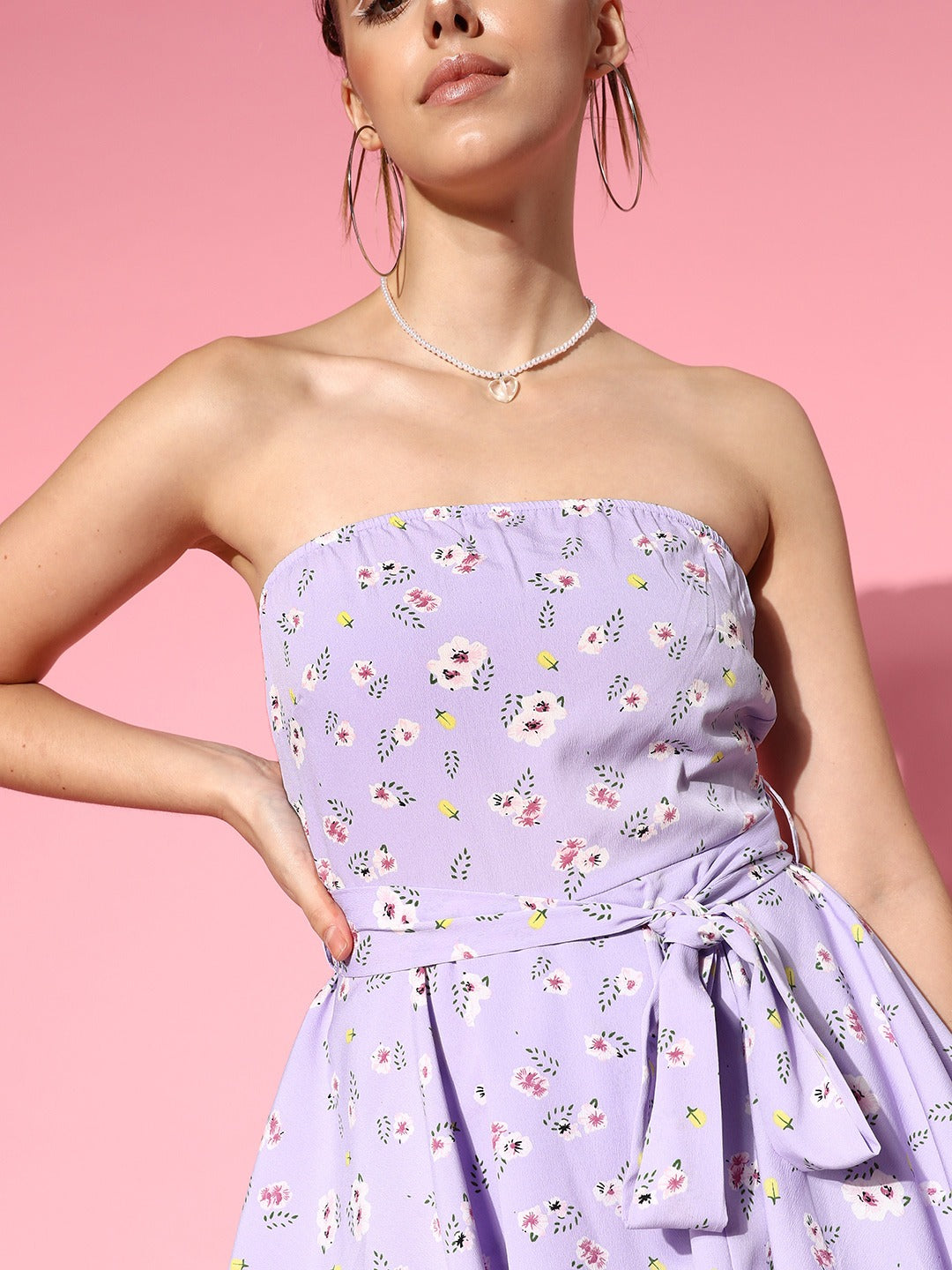 Berrylush Women Purple Floral Printed Off-Shoulder Neck Waist Tie-Up Layered Mini Playsuit