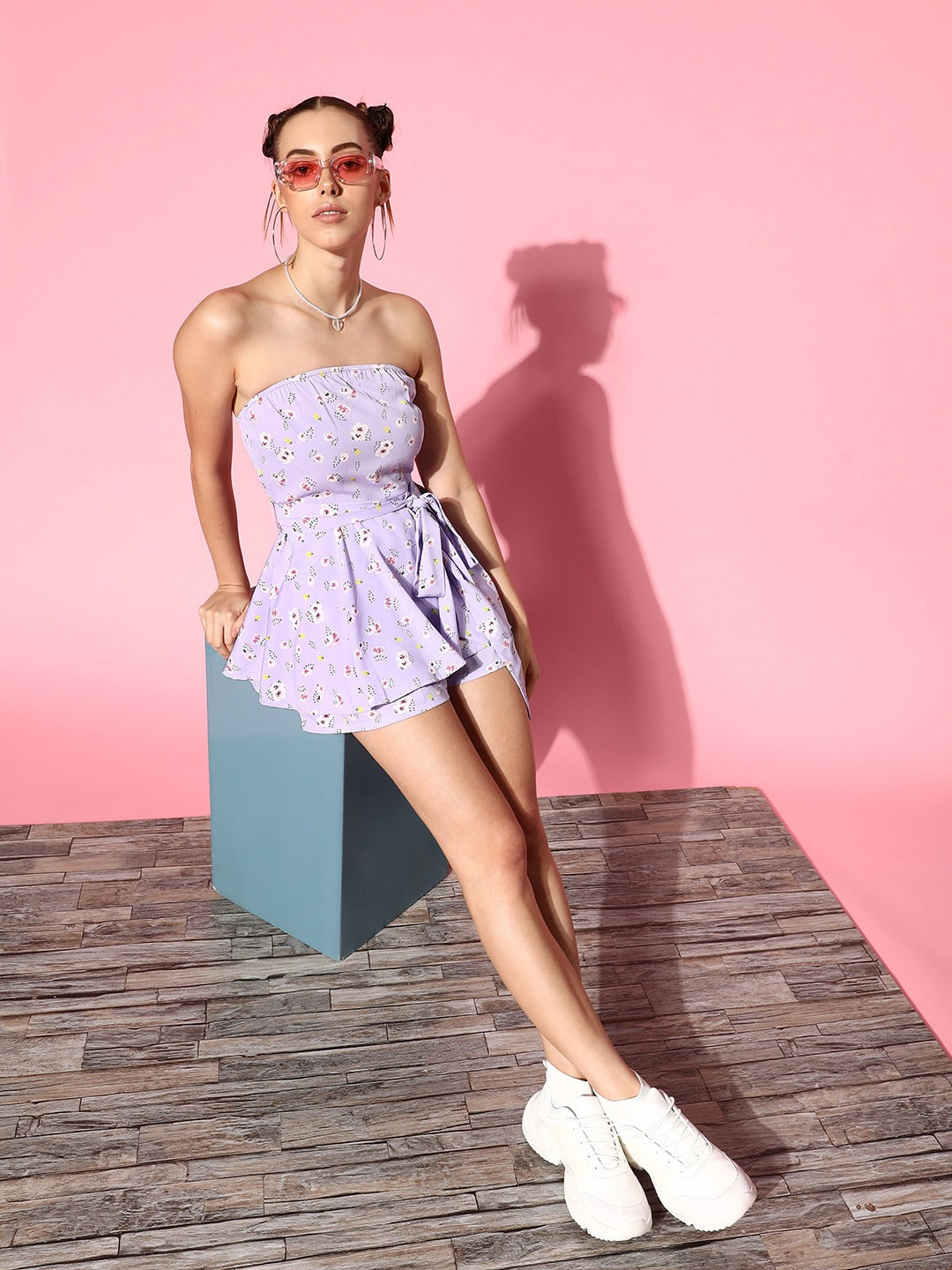 Elegantly blend in modern femininity with a tinge of playfulness with the addition of this pretty Purple Floral Printed Off-Shoulder Layered Mini Playsuit introduced by Berrylush. Styled in a sleeveless design give this playsuit a dash of versatility with an enticing appeal to your arms. Flaunting waist tie-up belt that lends an additional fitting option to this playsuit with a gleaming sheen. Designed in playsuit style to offer you a trendy casual look with limitless comfort and breathability. Complete your look flawlessly by wearing this playsuit with white sneakers, pearl earrings, pink sunglasses, and a sassy side bag.