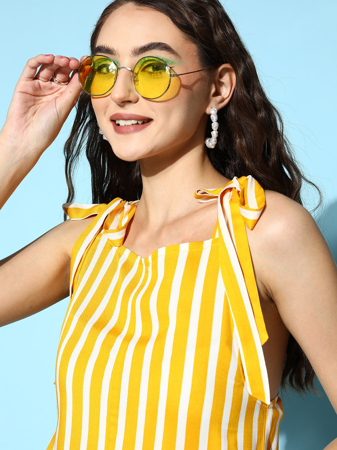 Berrylush Women Yellow & White Strip Printed Square Neck Tie-Up Strap Mini Playsuit